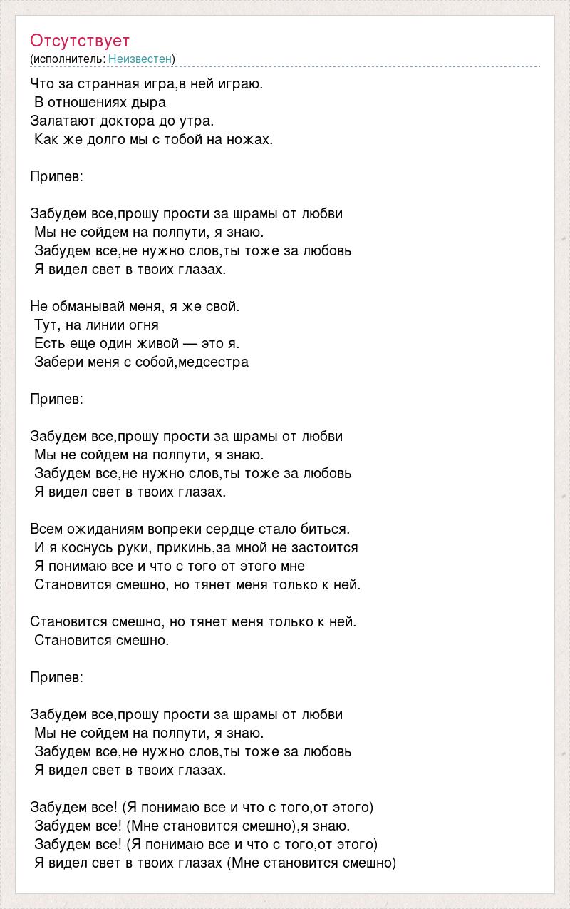Что за странная игра,в ней играю. В отношениях дыра Залатают доктора до утра. Как же долго мы с тобой на ножах. Припев: Забудем все,прошу прости за шрамы от любви Мы не сойдем на полпути, я знаю. Забудем все,не нужно слов,ты тоже за любовь Я видел свет в твоих глазах. Не обманывай меня, я же свой. Тут, на линии огня Есть еще один живой — это я. Забери меня с собой,медсестра Припев: Забудем все,прошу прости за шрамы от любви Мы не сойдем на полпути, я знаю. Забудем все,не нужно слов,ты тоже за любовь Я видел свет в твоих глазах. Всем ожиданиям вопреки сердце стало биться. И я коснусь руки, прикинь,за мной не застоится Я понимаю все и что с того от этого мне Становится смешно, но тянет меня только к ней. Становится смешно, но тянет меня только к ней. Становится смешно. Припев: Забудем все,прошу прости за шрамы от любви Мы не сойдем на полпути, я знаю. Забудем все,не нужно слов,ты тоже за любовь Я видел свет в твоих глазах. Забудем все! (Я понимаю все и что с того,от этого) Забудем все! (Мне становится смешно),я знаю. Забудем все! (Я понимаю все и что с того,от этого) Я видел свет в твоих глазах (Мне становится смешно)