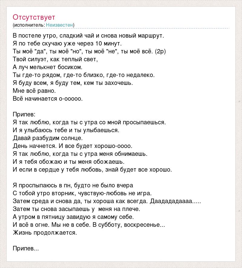 В постеле утро, сладкий чай и снова новый маршрут. Я по тебе скучаю уже через 10 минут. Ты моё "да", ты моё "но", ты моё "не", ты моё всё. (2р) Твой силуэт, как теплый свет, А луч мелькнет босиком. Ты где-то рядом, где-то близко, где-то недалеко. Я буду всем, я буду тем, кем ты захочешь. Мне всё равно. Всё начинается о-ооооо. Припев: Я так люблю, когда ты с утра со мной просыпаешься. И я улыбаюсь тебе и ты улыбаешься. Давай разбудим солнце. День начнется. И все будет хорошо-оооо. Я так люблю, когда ты с утра меня обнимаешь. И я тебя обожаю и ты меня обожаешь. И если в сердце у тебя любовь, знай будет все хорошо. Я проспыпаюсь в пн, будто не было вчера С тобой утро вторник, чувствую-любовь не игра. Затем среда и снова да, ты хороша как всегда. Даадададаааа..... Затем ты снова засыпаешь у меня на плече. А утром в пятницу завидую я самому себе. И всё в огне. Мы не в себе. В субботу, воскресенье... Жизнь продолжается. Припев...