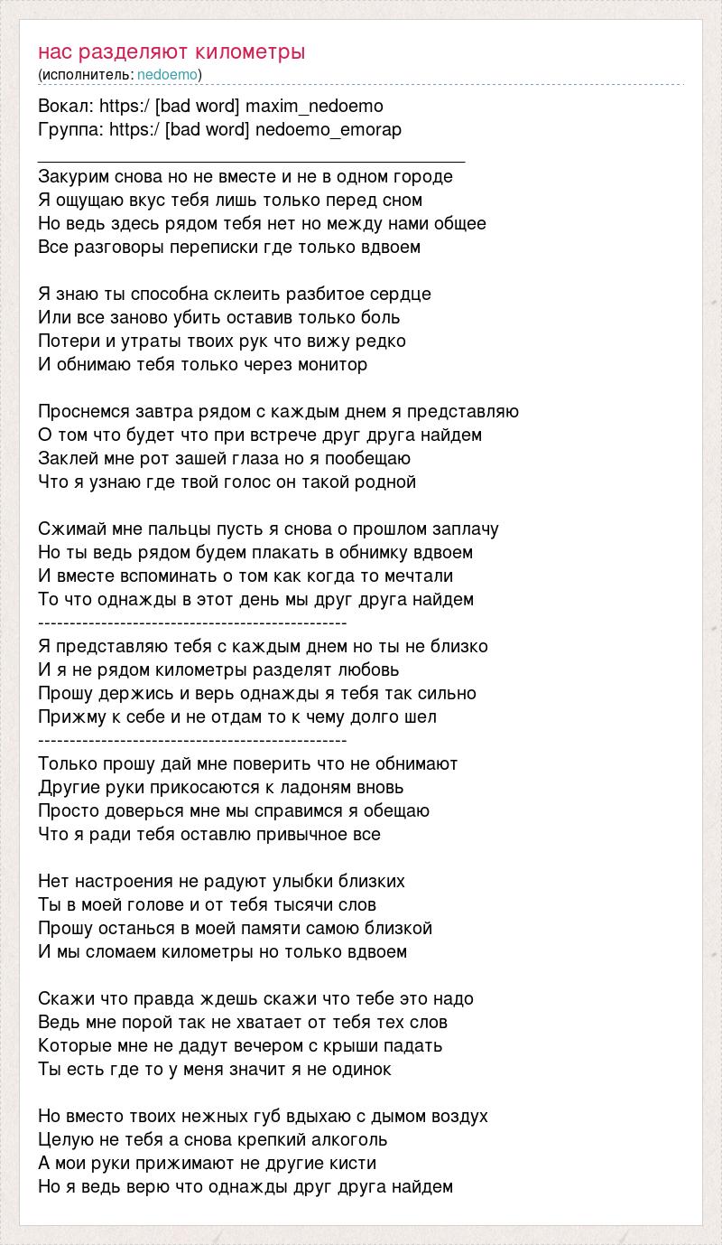 Вокал: https:/ [bad word] maxim_nedoemo Группа: https:/ [bad word] nedoemo_emorap ___________________________________________ Закурим снова но не вместе и не в одном городе Я ощущаю вкус тебя лишь только перед сном Но ведь здесь рядом тебя нет но между нами общее Все разговоры переписки где только вдвоем Я знаю ты способна склеить разбитое сердце Или все заново убить оставив только боль Потери и утраты твоих рук что вижу редко И обнимаю тебя только через монитор Проснемся завтра рядом с каждым днем я представляю О том что будет что при встрече друг друга найдем Заклей мне рот зашей глаза но я пообещаю Что я узнаю где твой голос он такой родной Сжимай мне пальцы пусть я снова о прошлом заплачу Но ты ведь рядом будем плакать в обнимку вдвоем И вместе вспоминать о том как когда то мечтали То что однажды в этот день мы друг друга найдем ------------------------------------------------- Я представляю тебя с каждым днем но ты не близко И я не рядом километры разделят любовь Прошу держись и верь однажды я тебя так сильно Прижму к себе и не отдам то к чему долго шел ------------------------------------------------- Только прошу дай мне поверить что не обнимают Другие руки прикосаются к ладоням вновь Просто доверься мне мы справимся я обещаю Что я ради тебя оставлю привычное все Нет настроения не радуют улыбки близких Ты в моей голове и от тебя тысячи слов Прошу останься в моей памяти самою близкой И мы сломаем километры но только вдвоем Скажи что правда ждешь скажи что тебе это надо Ведь мне порой так не хватает от тебя тех слов Которые мне не дадут вечером с крыши падать Ты есть где то у меня значит я не одинок Но вместо твоих нежных губ вдыхаю с дымом воздух Целую не тебя а снова крепкий алкоголь А мои руки прижимают не другие кисти Но я ведь верю что однажды друг друга найдем