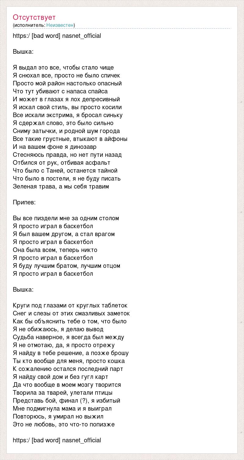 https:/ [bad word] nasnet_official Вышка: Я выдал это все, чтобы стало чище Я снюхал все, просто не было спичек Просто мой район настолько опасный Что тут убивают с напаса спайса И может в глазах я лох депресивный Я искал свой стиль, вы просто косили Все искали экстрима, я бросал синьку Я сдержал слово, это было сильно Сниму затычки, и родной шум города Все такие грустные, втыкают в айфоны И на вашем фоне я динозавр Стесняюсь правда, но нет пути назад Отбился от рук, отбивая асфальт Что было с Таней, останется тайной Что было в постели, я не буду писать Зеленая трава, а мы себя травим Припев: Вы все пиздели мне за одним столом Я просто играл в баскетбол Я был вашем другом, а стал врагом Я просто играл в баскетбол Она была всем, теперь никто Я просто играл в баскетбол Я буду лучшим братом, лучшим отцом Я просто играл в баскетбол Вышка: Круги под глазами от круглых таблеток Снег и слезы от этих смазливых заметок Как бы объяснить тебе о том, что было Я не обижаюсь, я делаю вывод Судьба наверное, я всегда был между Я не отмотаю, да, я просто отрежу Я найду в тебе решение, а позже брошу Ты кто вообще для меня, просто кошка К сожалению остался последний парт Я найду свой дом и без гугл карт Да что вообще в моем мозгу творится Творила за тварей, улетали птицы Представь бой, финал (?), я избитый Мне подмигнула мама и я выиграл Повторюсь, я умирал но выжил Это не любовь, это что-то попизже https:/ [bad word] nasnet_official