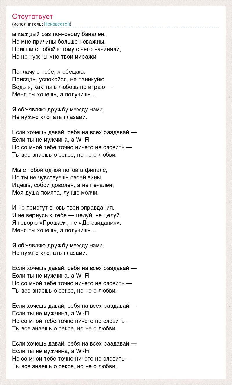 ы каждый раз по-новому банален, Но мне причины больше неважны. Пришли с тобой к тому с чего начинали, Но не нужны мне твои миражи. Поплачу о тебе, я обещаю. Присядь, успокойся, не паникуйю Ведь я, как ты в любовь не играю — Меня ты хочешь, а получишь… Я объявляю дружбу между нами, Не нужно хлопать глазами. Если хочешь давай, себя на всех раздавай — Если ты не мужчина, а Wi-Fi. Но со мной тебе точно ничего не словить — Ты все знаешь о сексе, но не о любви. Мы с тобой одной ногой в финале, Но ты не чувствуешь своей вины. Идёшь, собой доволен, а не печален; Моя душа помята, лучше молчи. И не помогут вновь твои оправдания. Я не вернусь к тебе — целуй, не целуй. Я говорю «Прощай», не «До свидания». Меня ты хочешь, а получишь… Я объявляю дружбу между нами, Не нужно хлопать глазами. Если хочешь давай, себя на всех раздавай — Если ты не мужчина, а Wi-Fi. Но со мной тебе точно ничего не словить — Ты все знаешь о сексе, но не о любви. Если хочешь давай, себя на всех раздавай — Если ты не мужчина, а Wi-Fi. Но со мной тебе точно ничего не словить — Ты все знаешь о сексе, но не о любви. Если хочешь давай, себя на всех раздавай — Если ты не мужчина, а Wi-Fi. Но со мной тебе точно ничего не словить — Ты все знаешь о сексе, но не о любви.