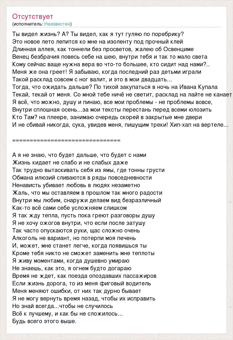 Ты видел жизнь? А? Ты видел, как я тут гуляю по поребрику? Это новое лето лепится ко мне на изоленту под прочный клей Длинная аллея, как тоннели без просветов, жалею об Освенциме Венец безбрачия повесь себе на шею, внутри тебя и так то мало света Кому сейчас ваще нужна вера во что-то большее, кто сидит над нами?.. Меня же она греет! Я забываю, когда последний раз детьми играли Такой расклад совсем с ног валит, и это в мои двадцать... Тогда, что ожидать дальше? По тихой закупаться в ночь на Ивана Купала Текай, текай от меня. Со мной тебе ничё не светит, расклад на лайте не канает Я всё, что можно, душу и пинаю, все мои проблемы - не проблемы вовсе, Внутри сплошная осень...за мои тексты перестань перед всеми юлозить Кто Там? на плеере, занимаю очередь скорей в закрытые мне двери И не сбивай никогда, сука, увидев меня, пишущим треки! Хип-хап на вертеле... =============================== А я не знаю, что будет дальше, что будет с нами Жизнь кидает не слабо и не слабых даже Так трудно вытаскивать себя из ямы, где тонны грусти Обмана илюзий сливаются в ряды повседневности Ненависть убивает любовь в людях незаметно Жаль, что мы оставляем в прошлом так много радости Внутри мы любим, снаружи делаем вид безразличный Как-то всё сами себе усложняем слишком Я так жду тепла, пусть пока греют разговоры душу Я не хочу ожогов внутри, что если после затушу Так часто опускаются руки, щас сложно очень Алкоголь не вариант, но потерпи моя печень И, может, мне станет легче, когда появишься ты Кроме тебя никто не сможет заменить мне теплоты Я живу моментами, когда душевно умираю Не знаешь, как это, я огнем будто догараю Время не ждет, как поезда опоздавших пассажиров Если жизнь дорога, то из меня фиговый водитель Меня меняют ошибки, от них так дурно бывает Я не могу вернуть время назад, чтобы их исправить Но знай всегда...чтобы не случилось Всё к лучшему, и как бы не сложилось... Будь всего этого выше.