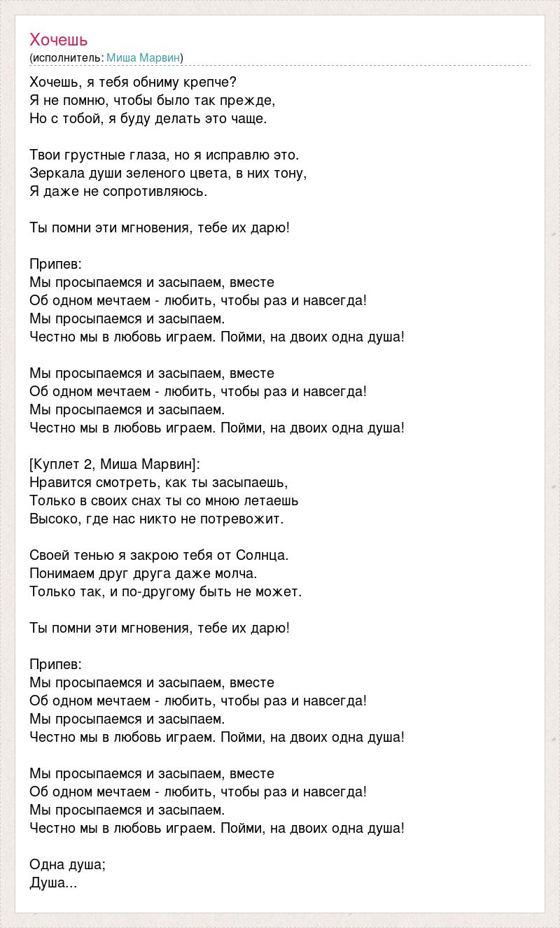 Хочешь, я тебя обниму крепче? Я не помню, чтобы было так прежде, Но с тобой, я буду делать это чаще. Твои грустные глаза, но я исправлю это. Зеркала души зеленого цвета, в них тону, Я даже не сопротивляюсь. Ты помни эти мгновения, тебе их дарю! Припев: Мы просыпаемся и засыпаем, вместе Об одном мечтаем - любить, чтобы раз и навсегда! Мы просыпаемся и засыпаем. Честно мы в любовь играем. Пойми, на двоих одна душа! Мы просыпаемся и засыпаем, вместе Об одном мечтаем - любить, чтобы раз и навсегда! Мы просыпаемся и засыпаем. Честно мы в любовь играем. Пойми, на двоих одна душа! [Куплет 2, Миша Марвин]: Нравится смотреть, как ты засыпаешь, Только в своих снах ты со мною летаешь Высоко, где нас никто не потревожит. Своей тенью я закрою тебя от Солнца. Понимаем друг друга даже молча. Только так, и по-другому быть не может. Ты помни эти мгновения, тебе их дарю! Припев: Мы просыпаемся и засыпаем, вместе Об одном мечтаем - любить, чтобы раз и навсегда! Мы просыпаемся и засыпаем. Честно мы в любовь играем. Пойми, на двоих одна душа! Мы просыпаемся и засыпаем, вместе Об одном мечтаем - любить, чтобы раз и навсегда! Мы просыпаемся и засыпаем. Честно мы в любовь играем. Пойми, на двоих одна душа! Одна душа; Душа...