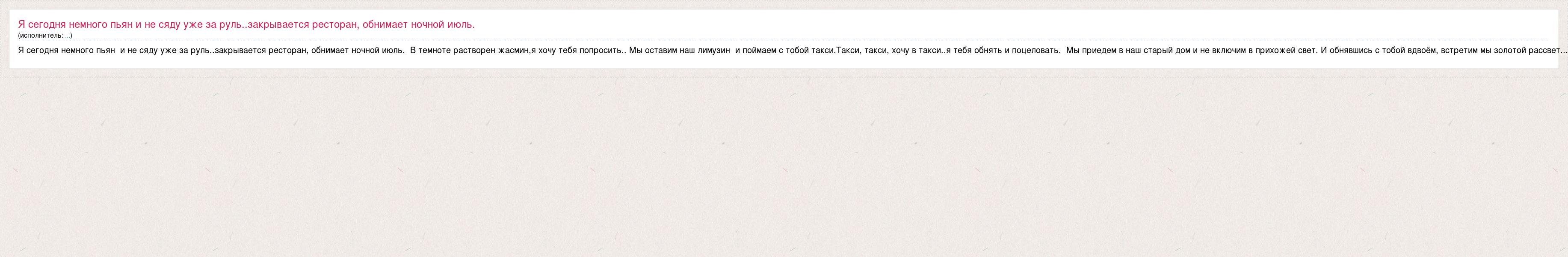 Я сегодня немного пьян и не сяду уже за руль..закрывается ресторан, обнимает ночной июль. В темноте растворен жасмин,я хочу тебя попросить.. Мы оставим наш лимузин и поймаем с тобой такси.Такси, такси, хочу в такси..я тебя обнять и поцеловать. Мы приедем в наш старый дом и не включим в прихожей свет. И обнявшись с тобой вдвоём, встретим мы золотой рассвет...