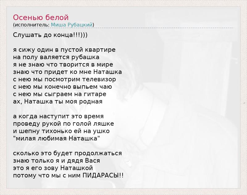 Слушать до конца!!!))) я сижу один в пустой квартире на полу валяется рубашка я не знаю что творится в мире знаю что придет ко мне Наташка с нею мы посмотрим телевизор с нею мы конечно выпьем чаю с нею мы сыграем на гитаре ах, Наташка ты моя родная а когда наступит это время проведу рукой по голой ляшке и шепну тихонько ей на ушко "милая любимая Наташка" сколько это будет продолжаться знаю только я и дядя Вася это я его зову Наташкой потому что мы с ним ПИДАРАСЫ!!
