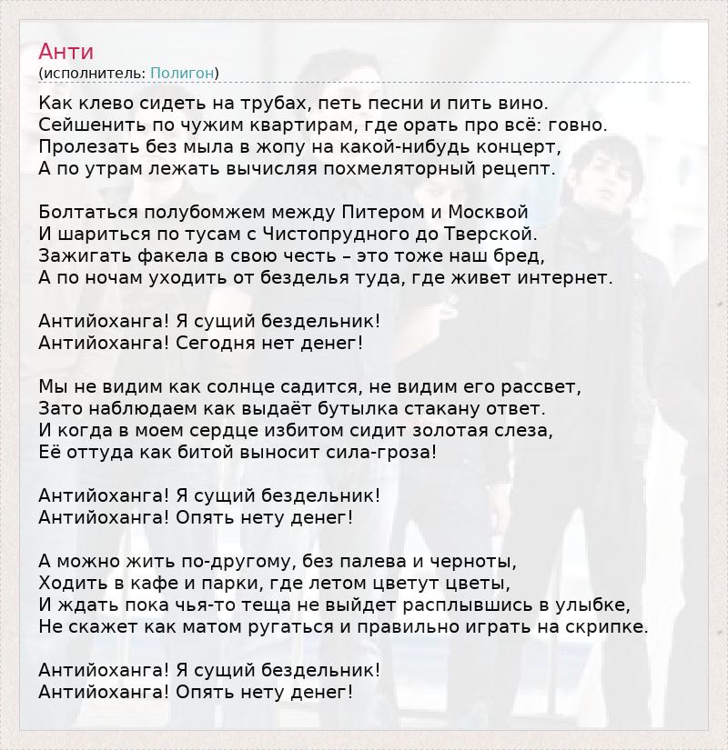 Как клево сидеть на трубах, петь песни и пить вино. Сейшенить по чужим квартирам, где орать про всё: говно. Пролезать без мыла в жопу на какой-нибудь концерт, А по утрам лежать вычисляя похмеляторный рецепт. Болтаться полубомжем между Питером и Москвой И шариться по тусам с Чистопрудного до Тверской. Зажигать факела в свою честь – это тоже наш бред, А по ночам уходить от безделья туда, где живет интернет. Антийоханга! Я сущий бездельник! Антийоханга! Сегодня нет денег! Мы не видим как солнце садится, не видим его рассвет, Зато наблюдаем как выдаёт бутылка стакану ответ. И когда в моем сердце избитом сидит золотая слеза, Её оттуда как битой выносит сила-гроза! Антийоханга! Я сущий бездельник! Антийоханга! Опять нету денег! А можно жить по-другому, без палева и черноты, Ходить в кафе и парки, где летом цветут цветы, И ждать пока чья-то теща не выйдет расплывшись в улыбке, Не скажет как матом ругаться и правильно играть на скрипке. Антийоханга! Я сущий бездельник! Антийоханга! Опять нету денег!