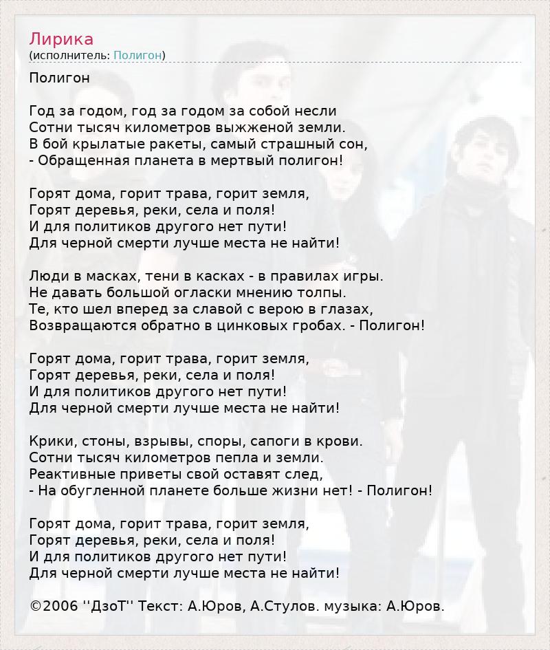 Полигон Год за годом, год за годом за собой несли Сотни тысяч километров выжженой земли. В бой крылатые ракеты, самый страшный сон, - Обращенная планета в мертвый полигон! Горят дома, горит трава, горит земля, Горят деревья, реки, села и поля! И для политиков другого нет пути! Для черной смерти лучше места не найти! Люди в масках, тени в касках - в правилах игры. Не давать большой огласки мнению толпы. Те, кто шел вперед за славой с верою в глазах, Возвращаются обратно в цинковых гробах. - Полигон! Горят дома, горит трава, горит земля, Горят деревья, реки, села и поля! И для политиков другого нет пути! Для черной смерти лучше места не найти! Крики, стоны, взрывы, споры, сапоги в крови. Сотни тысяч километров пепла и земли. Реактивные приветы свой оставят след, - На обугленной планете больше жизни нет! - Полигон! Горят дома, горит трава, горит земля, Горят деревья, реки, села и поля! И для политиков другого нет пути! Для черной смерти лучше места не найти! ©2006 ''ДзоТ'' Текст: А.Юров, А.Стулов. музыка: А.Юров.