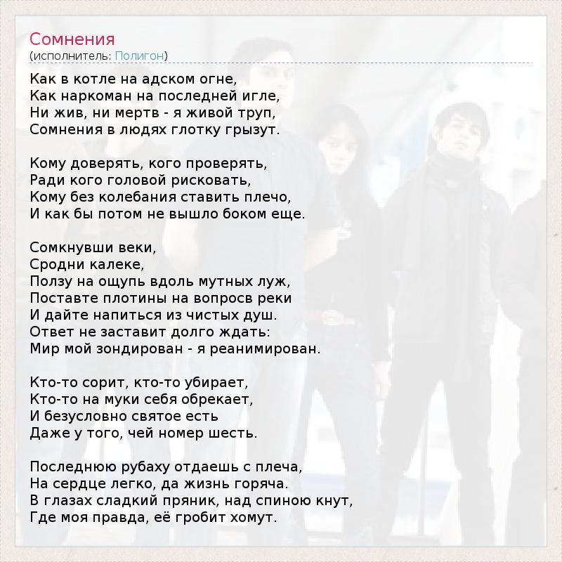 Как в котле на адском огне, Как наркоман на последней игле, Ни жив, ни мертв - я живой труп, Сомнения в людях глотку грызут. Кому доверять, кого проверять, Ради кого головой рисковать, Кому без колебания ставить плечо, И как бы потом не вышло боком еще. Сомкнувши веки, Сродни калеке, Ползу на ощупь вдоль мутных луж, Поставте плотины на вопросв реки И дайте напиться из чистых душ. Ответ не заставит долго ждать: Мир мой зондирован - я реанимирован. Кто-то сорит, кто-то убирает, Кто-то на муки себя обрекает, И безусловно святое есть Даже у того, чей номер шесть. Последнюю рубаху отдаешь с плеча, На сердце легко, да жизнь горяча. В глазах сладкий пряник, над спиною кнут, Где моя правда, её гробит хомут.
