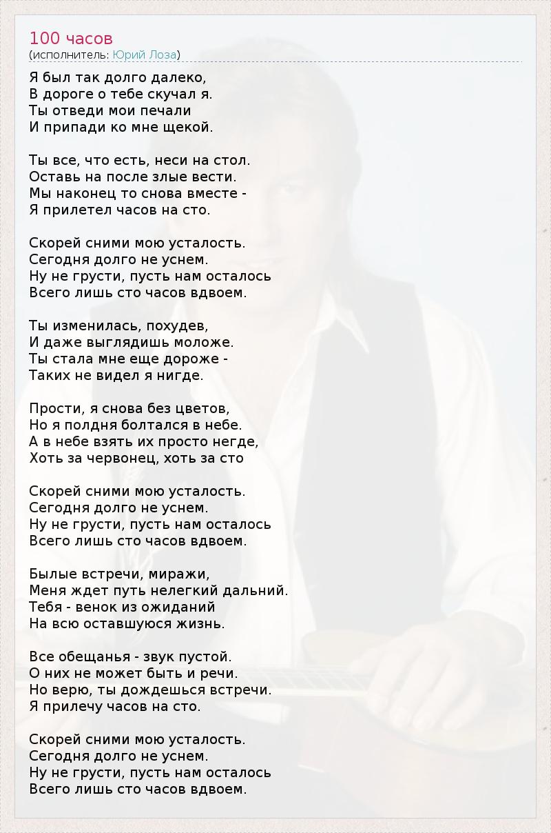 Это интересно:Лоза, Юрий Эдуардович - певец, поэт и композитор.Родился 1 февраля 1954 года в Свердловске в семье служащих: отец — инженер-конструктор, мать — бухгалтер. Когда Юрию исполнилось семь лет, семья переехала в Алма-Ату. В 13 лет стал играть на гитаре. После окончания школы Лоза поступил в Казахский государственный университет, но бросил учебу и ушел в армию.После службы в армии поступил... продолжение