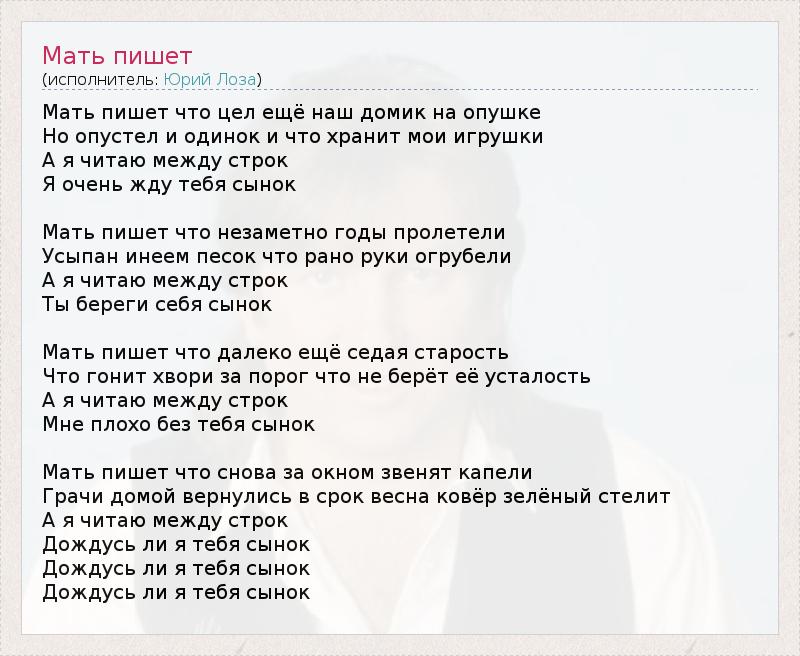 Мать пишет что цел ещё наш домик на опушке Но опустел и одинок и что хранит мои игрушки А я читаю между строк Я очень жду тебя сынок Мать пишет что незаметно годы пролетели Усыпан инеем песок что рано руки огрубели А я читаю между строк Ты береги себя сынок Мать пишет что далеко ещё седая старость Что гонит хвори за порог что не берёт её усталость А я читаю между строк Мне плохо без тебя сынок Мать пишет что снова за окном звенят капели Грачи домой вернулись в срок весна ковёр зелёный стелит А я читаю между строк Дождусь ли я тебя сынок Дождусь ли я тебя сынок Дождусь ли я тебя сынок