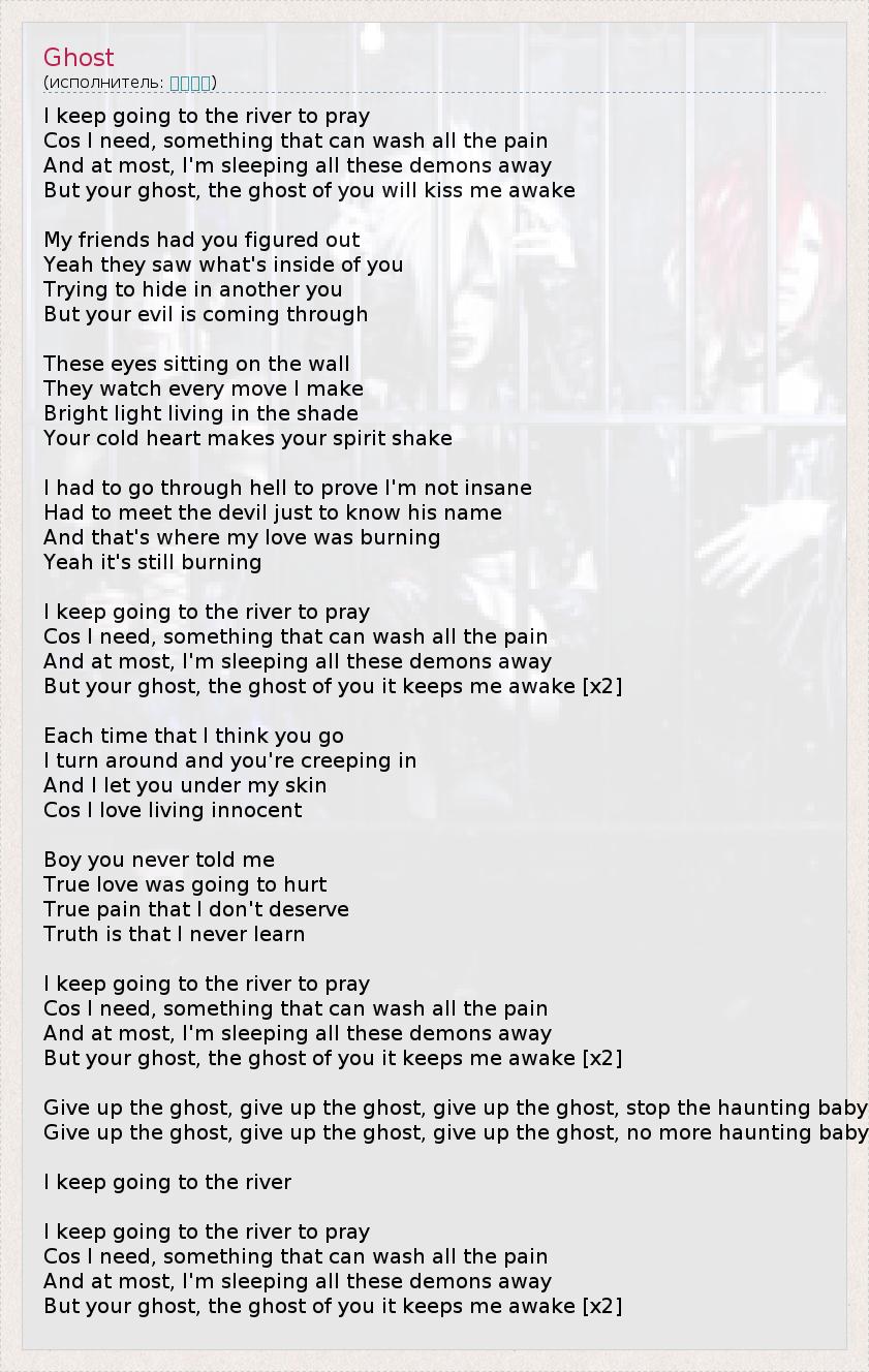 I keep going to the river to pray Cos I need, something that can wash all the pain And at most, I'm sleeping all these demons away But your ghost, the ghost of you will kiss me awake My friends had you figured out Yeah they saw what's inside of you Trying to hide in another you But your evil is coming through These eyes sitting on the wall They watch every move I make Bright light living in the shade Your cold heart makes your spirit shake I had to go through hell to prove I'm not insane Had to meet the devil just to know his name And that's where my love was burning Yeah it's still burning I keep going to the river to pray Cos I need, something that can wash all the pain And at most, I'm sleeping all these demons away But your ghost, the ghost of you it keeps me awake [x2] Each time that I think you go I turn around and you're creeping in And I let you under my skin Cos I love living innocent Boy you never told me True love was going to hurt True pain that I don't deserve Truth is that I never learn I keep going to the river to pray Cos I need, something that can wash all the pain And at most, I'm sleeping all these demons away But your ghost, the ghost of you it keeps me awake [x2] Give up the ghost, give up the ghost, give up the ghost, stop the haunting baby Give up the ghost, give up the ghost, give up the ghost, no more haunting baby I keep going to the river I keep going to the river to pray Cos I need, something that can wash all the pain And at most, I'm sleeping all these demons away But your ghost, the ghost of you it keeps me awake [x2]