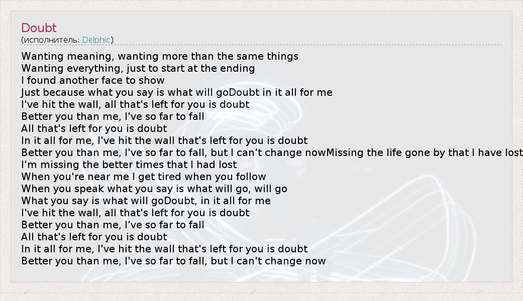 Это интересно:Delphic - британская электронная группа из Манчестера. Подписаны на лейбл Polydor. Свой первый сингл, Counterpoint, выпустили в апреле 2009-ого на лейбле R&S Records. Спродюсировал трек Эван Пирсон, который впоследствии выступил продюсером их дебютного альбома Acolyte. Следующим синглом стала песня This Momentary, выпущена на лейбле Kitsuné Music. Клип на эту композицию получил три номинации на UK Music Video Awards Ранее существовали... продолжение