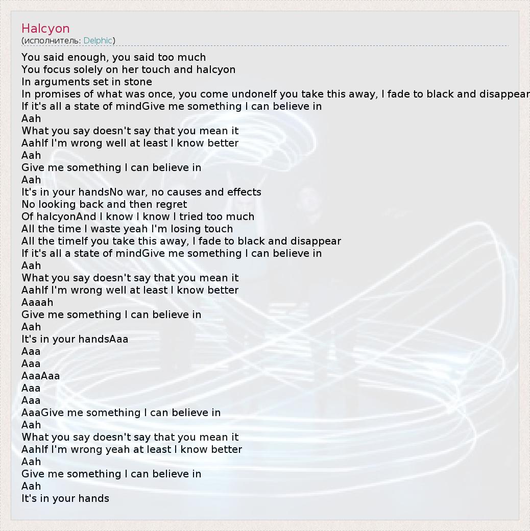 You said enough, you said too much You focus solely on her touch and halcyon In arguments set in stone In promises of what was once, you come undoneIf you take this away, I fade to black and disappear If it's all a state of mindGive me something I can believe in Aah What you say doesn't say that you mean it AahIf I'm wrong well at least I know better Aah Give me something I can believe in Aah It's in your handsNo war, no causes and effects No looking back and then regret Of halcyonAnd I know I know I tried too much All the time I waste yeah I'm losing touch All the timeIf you take this away, I fade to black and disappear If it's all a state of mindGive me something I can believe in Aah What you say doesn't say that you mean it AahIf I'm wrong well at least I know better Aaaah Give me something I can believe in Aah It's in your handsAaa Aaa Aaa AaaAaa Aaa Aaa AaaGive me something I can believe in Aah What you say doesn't say that you mean it AahIf I'm wrong yeah at least I know better Aah Give me something I can believe in Aah It's in your hands