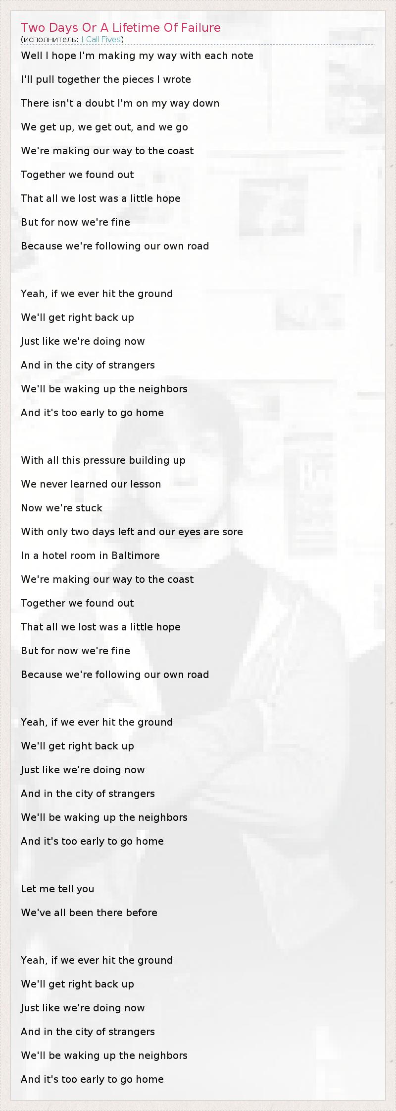 ГлавнаяИсполнителиI Call FivesTwo Days Or A Lifetime Of Failure