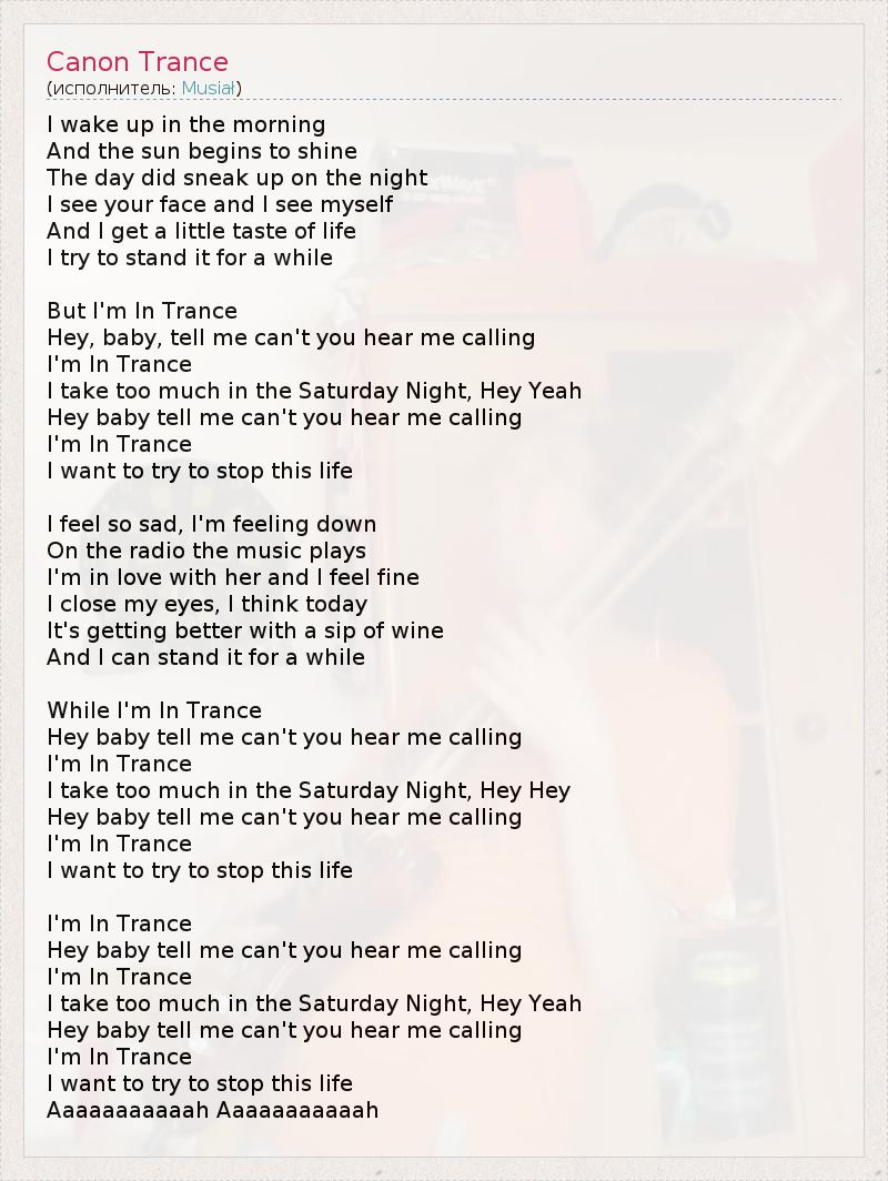 Просыпаюсь утром, И солнце начинает светить. День подкрался вслед за ночью, Я вижу твое лицо, и вижу себя. И я ощущаю лёгкий привкус жизни И пытаюсь удержать его хоть на чуть-чуть... Но я в трансе Эй, детка, скажи мне, ты не слышишь, как я зову? Я в трансе, Я принял слишком много субботней ночью, о да. Эй, детка, скажи мне, ты не слышишь, как я зову? Я в трансе, Я хочу прекратить такую жизнь. Мне так грустно, я чувствую усталость, По радио звучит музыка. Я люблю ее, и мне очень хорошо. Я закрываю глаза, я думаю, сегодня Станет лучше с глотком вина, И я смогу выдержать еще немного... Но я в трансе Эй, детка, скажи мне, ты не слышишь, как я зову? Я в трансе, Я принял слишком много субботней ночью, о да. Эй, детка, скажи мне, ты не слышишь, как я зову? Я в трансе, Я хочу прекратить такую жизнь. Но я в трансе Эй, детка, скажи мне, ты не слышишь, как я зову? Я в трансе, Я принял слишком много субботней ночью, о да. Эй, детка, скажи мне, ты не слышишь, как я зову? Я в трансе, Я хочу прекратить такую жизнь. Аааааааааааа! Аааааааааааа!