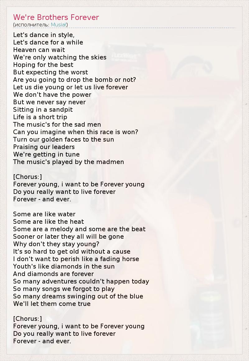 Давай станцуем стильно, Давай немного попляшем. Небеса подождут, Поэтому мы просто глядим на них, Надеясь на лучшее, Но ожидая худшего. На нас упадет бомба или нет? Умрем ли мы молодыми, или будем жить вечно? У нас нет власти, Но мы никогда не говорим "никогда". Заседая в песчаном карьере, Жизнь лишь короткое путешествие, Музыка для печальных людей. Когда, по-твоему, будет выиграна эта гонка? Обратим наши загорелые лица к Солнцу: Хвала нашим богам - Мы в теме. Музыку играют сумасшедшие люди. [Припев:] Вечно молодым, я хочу быть вечно молодым Ты точно хочешь жить вечно? Вечно. Некоторые из нас холодны, как вода, Некоторые горячи, как пламя. Кто-то - мелодия, а кто-то - ритм. Рано или поздно и те, и другие канут в лету. Почему же они не остаются молодыми? Это так тяжело - стареть без причины. Я не хочу умереть, как дряхлая лошадь. Молодость как бриллианты, сверкающие на солнце, А бриллианты вечны... Сегодня не случилось стольких приключений! Мы забыли сыграть столько красивых песен! У нас ещё будет столько неожиданных желаний, Так пусть они все сбудутся! [Припев:] Вечно молодым, я хочу быть вечно молодым Ты точно хочешь жить вечно? Вечно.
