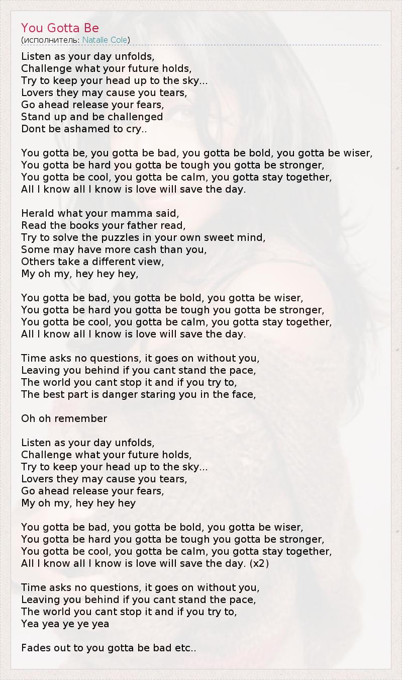 Послушайте, как ваш день разворачивается, Бросьте вызов , что ваше будущее держит , Старайтесь держать голову к небу ... Любители они могут причинить вам слезы , Идем дальше выпускать свои страхи , Встань и быть оспорены Не будьте стыдно плакать .. Ты должен быть , ты должен быть плохим , ты должен быть смелым , ты должен быть мудрее, Ты должен быть жесткий ты должен быть жестким ты должен быть сильнее , Ты должен быть прохладным , ты должен быть спокоен , ты должен остаться вместе , Все, что я знаю все, что я знаю, это любовь спасет день . Вестник , что сказал твой мама, Прочитайте книги ваш отец читал , Попробуйте для решения головоломок в вашем собственном сладкого виду , Некоторые могут иметь больше денег , чем у вас , Другие придерживаются иного мнения , Вот это да , эй , эй, эй , Ты должен быть плохим , ты должен быть смелым , ты должен быть мудрее, Ты должен быть жесткий ты должен быть жестким ты должен быть сильнее , Ты должен быть прохладным , ты должен быть спокоен , ты должен остаться вместе , Все, что я знаю все, что я знаю, это любовь спасет день . Время никаких вопросов не задает , он идет без вас , Оставляю тебя позади, если вы не можете выдержать темп , Мир, который вы не можете остановить его и , если вы пытаетесь , Самое приятное то, опасность глядя вам в лицо, О, о, помню Послушайте, как ваш день разворачивается, Бросьте вызов , что ваше будущее держит , Старайтесь держать голову к небу ... Любители они могут причинить вам слезы , Идем дальше выпускать свои страхи , Вот это да , эй , эй, эй Ты должен быть плохим , ты должен быть смелым , ты должен быть мудрее, Ты должен быть жесткий ты должен быть жестким ты должен быть сильнее , Ты должен быть прохладным , ты должен быть спокоен , ты должен остаться вместе , Все, что я знаю все, что я знаю, это любовь спасет день . (x2) Время никаких вопросов не задает , он идет без вас , Оставляю тебя позади, если вы не можете выдержать темп , Мир, который вы не можете остановить его и , если вы пытаетесь , Да да йе йе да Постепенно исчезает с вами должен быть плохим и т.д. .