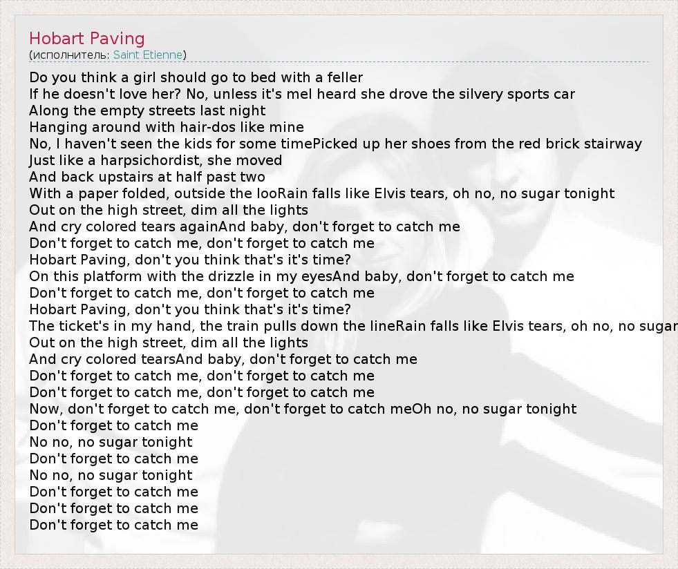 Do you think a girl should go to bed with a feller If he doesn't love her? No, unless it's meI heard she drove the silvery sports car Along the empty streets last night Hanging around with hair-dos like mine No, I haven't seen the kids for some timePicked up her shoes from the red brick stairway Just like a harpsichordist, she moved And back upstairs at half past two With a paper folded, outside the looRain falls like Elvis tears, oh no, no sugar tonight Out on the high street, dim all the lights And cry colored tears againAnd baby, don't forget to catch me Don't forget to catch me, don't forget to catch me Hobart Paving, don't you think that's it's time? On this platform with the drizzle in my eyesAnd baby, don't forget to catch me Don't forget to catch me, don't forget to catch me Hobart Paving, don't you think that's it's time? The ticket's in my hand, the train pulls down the lineRain falls like Elvis tears, oh no, no sugar Out on the high street, dim all the lights And cry colored tearsAnd baby, don't forget to catch me Don't forget to catch me, don't forget to catch me Don't forget to catch me, don't forget to catch me Now, don't forget to catch me, don't forget to catch meOh no, no sugar tonight Don't forget to catch me No no, no sugar tonight Don't forget to catch me No no, no sugar tonight Don't forget to catch me Don't forget to catch me Don't forget to catch me