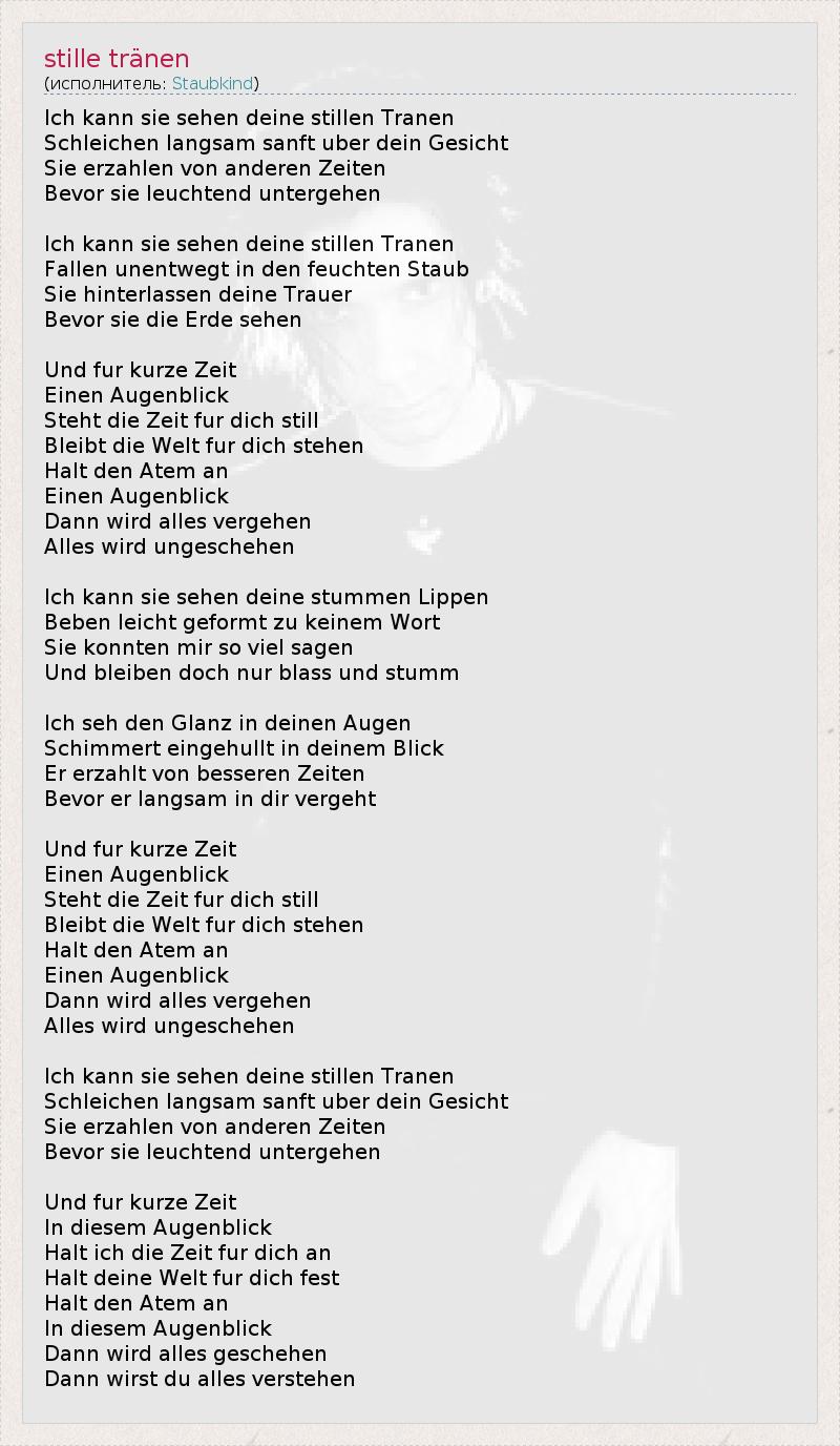 Это интересно:Творческий соло-проект Луиса Манке (Louis Manke) (гитариста из Terminal Choice), созданный в 2003 году. Выпустил четыре альбома: "Traumfänger" (2004), "Zu Weit" (2007), "Staubkind" (2012) и "Alles Was Ich Bin" (2014).Притягательная, с доминирующим гитарным звучанием музыка; эмоциональная, идущая из недр души лирика; "надломленный" чувственный вокал…