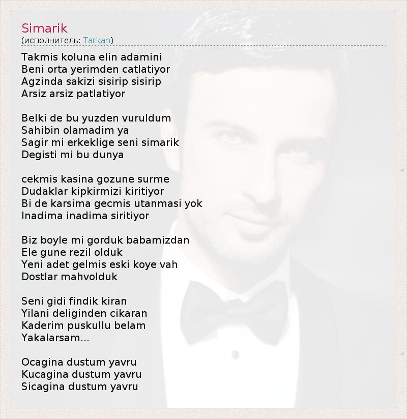 Это интересно:Тарка́н Теветоолу (тур. Tarkan Tevetoğlu; 17 октября 1972, Альцай, Рейнланд-Пфальц), более известный как просто Тарка́н — турецкий певец, лауреат многих премий как в Турции, так и в мире. Начал свою сольную карьеру в начале 1992 года. Таркан выпустил несколько платиновых альбомов, распроданных общих количеством около 25 миллионов копий. Он также занимается продюсированием и является владельцем музыкальной... продолжение