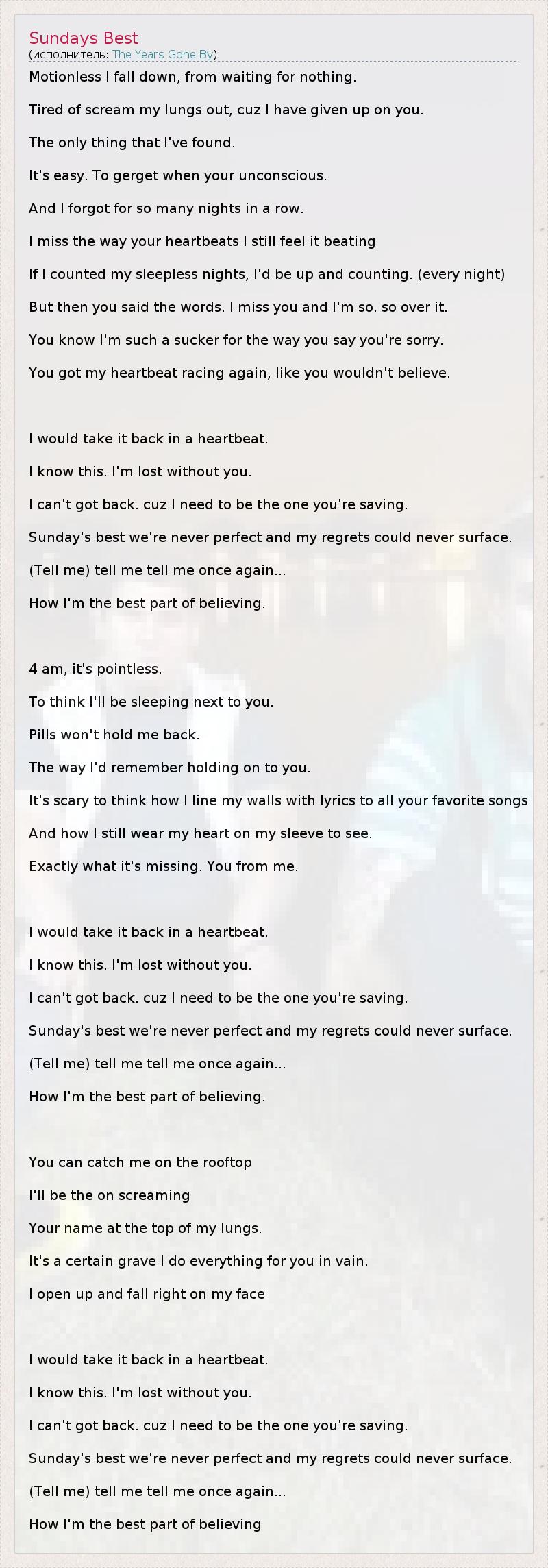 Motionless I fall down, from waiting for nothing. Tired of scream my lungs out, cuz I have given up on you. The only thing that I've found. It's easy. To gerget when your unconscious. And I forgot for so many nights in a row. I miss the way your heartbeats I still feel it beating If I counted my sleepless nights, I'd be up and counting. (every night) But then you said the words. I miss you and I'm so. so over it. You know I'm such a sucker for the way you say you're sorry. You got my heartbeat racing again, like you wouldn't believe. I would take it back in a heartbeat. I know this. I'm lost without you. I can't got back. cuz I need to be the one you're saving. Sunday's best we're never perfect and my regrets could never surface. (Tell me) tell me tell me once again... How I'm the best part of believing. 4 am, it's pointless. To think I'll be sleeping next to you. Pills won't hold me back. The way I'd remember holding on to you. It's scary to think how I line my walls with lyrics to all your favorite songs And how I still wear my heart on my sleeve to see. Exactly what it's missing. You from me. I would take it back in a heartbeat. I know this. I'm lost without you. I can't got back. cuz I need to be the one you're saving. Sunday's best we're never perfect and my regrets could never surface. (Tell me) tell me tell me once again... How I'm the best part of believing. You can catch me on the rooftop I'll be the on screaming Your name at the top of my lungs. It's a certain grave I do everything for you in vain. I open up and fall right on my face I would take it back in a heartbeat. I know this. I'm lost without you. I can't got back. cuz I need to be the one you're saving. Sunday's best we're never perfect and my regrets could never surface. (Tell me) tell me tell me once again... How I'm the best part of believing