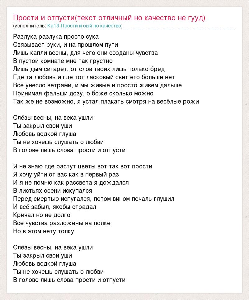 Главная→Исполнители→Ка13-Прости и оый но качество→Прости и отпусти(текст отличный но качество не гууд)