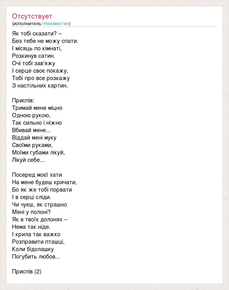 Як тобі сказати? – Без тебе не можу спати. І місяць по кімнаті, Розкинув сатин. Очі тобі зав’яжу І серце своє покажу, Тобі про все розкажу З настільних картин. Приспів: Тримай мене міцно Одною рукою, Так сильно і ніжно Вбивай мене... Віддай мені муку Своїми руками, Моїми губами лікуй, Лікуй себе... Посеред моєї хати На мене будеш кричати, Бо як же тобі порвати І в серці сліди. Чи чуєш, як страшно Мені у полоні? Як в твоїх долонях – Нема так ніде. І крила так важко Розправити пташці, Коли бідолашку Погубить любов... Приспів (2)