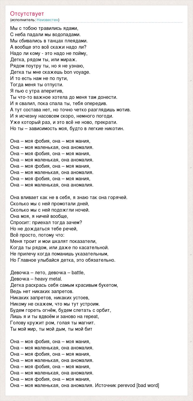 Мы с тобою травились ядами, С неба падали мы водопадами. Мы сбивались в танцах плеядами. А вообще это всё скажи надо ли? Надо ли кому - это надо не пойму, Детка, рядом ты, или мираж. Рядом поутру ты, но я не узнаю, Детка ты мне скажешь bon voyage. И то есть нам не по пути, Тогда меня ты отпусти. Я пью с утра аперитив, Ты что-то важное хотела до меня там донести. И я свалил, пока спала ты, тебя опередив. А тут состава нет, но точно четко разглядишь мотив. И я исчезну насовсем скоро, немного погоди. Уже который раз, и это всё не ново, прекрати. Но ты – зависимость моя, будто в легкие никотин. Она – моя фобия, она – моя мания, Она – моя маленькая, она аномалия. Она – моя фобия, она – моя мания, Она – моя маленькая, она аномалия. Она – моя фобия, она – моя мания, Она – моя маленькая, она аномалия. Она – моя фобия, она – моя мания, Она – моя маленькая, она аномалия. Она вливает как не в себя, я знаю так она горячей. Сколько мы с ней промотали дней, Сколько мы с ней подожгли ночей. Она моя, я ничей вообще, Спросит: приехал тогда зачем? Но не дождаться тебе речей, Всё просто, потому что: Меня троит и мои шкалят показатели, Когда ты рядом, или даже по касательной. Не прилечу когда поманишь указательным, Но Главное улыбайся детка, это обязательно. Девочка – лето, девочка – battle, Девочка – heavy metal. Детка раскрась себя самым красивым букетом, Ведь нет никаких запретов. Никаких запретов, никаких устоев, Никому не скажем, что мы тут устроим. Будем гореть огнём, будем слетать с орбит, Лишь я и ты вдвоём и заново на repeat, Голову кружит ром, голая ты магнит. Ты мой мир, ты мой дым, ты мой бит Она – моя фобия, она – моя мания, Она – моя маленькая, она аномалия. Она – моя фобия, она – моя мания, Она – моя маленькая, она аномалия. Она – моя фобия, она – моя мания, Она – моя маленькая, она аномалия. Она – моя фобия, она – моя мания, Она – моя маленькая, она аномалия. Источник perevod [bad word]