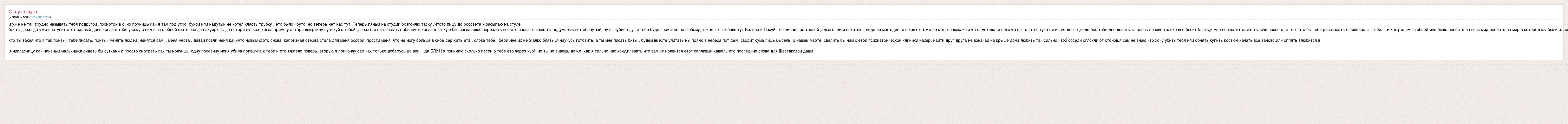 и уже не так трудно называть тебя подругой ,посмотри в окно помнишь как я там под утро, бухой или надутый не хотел класть трубку , ето было круто ,но теперь нет нас тут. Теперь пяный на студии розгоняю таску ,Чтото пишу до россвета и засыпаю на стуле блять да когда уже наступит етот сраный день,когда я тебя увижу с ним в свадебной фоте, когда нахуярюсь до потери пульса ,когда прямо у алтаря выкрикну ну и хуй с тобой ,да кого я пытаюсь тут обнануть,когда в лёгкую бы согласился пережить все ето снова, я знаю ты подумаешь вот ебанутый, ну в глубине души тебе будет приятно по любому, такая вот любовь тут Больно и Похуй , я заменил её травой ,алкоголем и похотью , ведь не мог один ,и с кемто тоже не мог, на щеках кожа намоклла ,и похоже на то что я тут пожил не долго ,ведь бес тебя мне ловить та здесь нечиво только всё бесит блять,и мне не хватит даже тысячи песен для того что бы тебе россказать я сильнно я любил , и как рядом с тобоой мне было поебать на весь мир,поебать на мир в котором мы были одни кто ты такая что я так привык тебе писать, привык менять людей ,менятся сам , меня места , давай позли меня какимто новым фото снова, капризная стерва стала для меня особой ,прости меня что не могу больше в сибе держать ета , слова тебе , бери мне их не жалко блять ,я научусь готовить, а ты мне писать биты , будем вместе улитать мы прямо в небеса пот дым, сводит сума лишь мысель о нашем марте ,свалить бы нам с етой психиатрической клиники нахер, найти друг друга не взначай на крыше дома,любить так сильно чтоб соседи оглохли от стонов,я сам не знаю что хочу убить тебя или обнять,купить костюм начать всё заново,или оппять влюбится в 8-микласницу как наивный мальчишка сидеть бы сутками и просто смотреть как ты молчишь, одну половину меня убила привычка к тебе и ето тяжело поверь, вторую я прикончу сам как только доберусь до вен, да БЛИН я понимаю сколько песен о тебе ето через чур! ,но ты не знаешь даже как я сильно нас хочу,плевать что вам не нравится етот сапливый кашель ето последние слова для Шестаковой даши