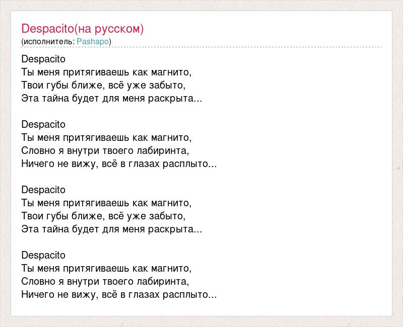 Despacito Ты меня притягиваешь как магнито, Твои губы ближе, всё уже забыто, Эта тайна будет для меня раскрыта... Despacito Ты меня притягиваешь как магнито, Словно я внутри твоего лабиринта, Ничего не вижу, всё в глазах расплыто... Despacito Ты меня притягиваешь как магнито, Твои губы ближе, всё уже забыто, Эта тайна будет для меня раскрыта... Despacito Ты меня притягиваешь как магнито, Словно я внутри твоего лабиринта, Ничего не вижу, всё в глазах расплыто...