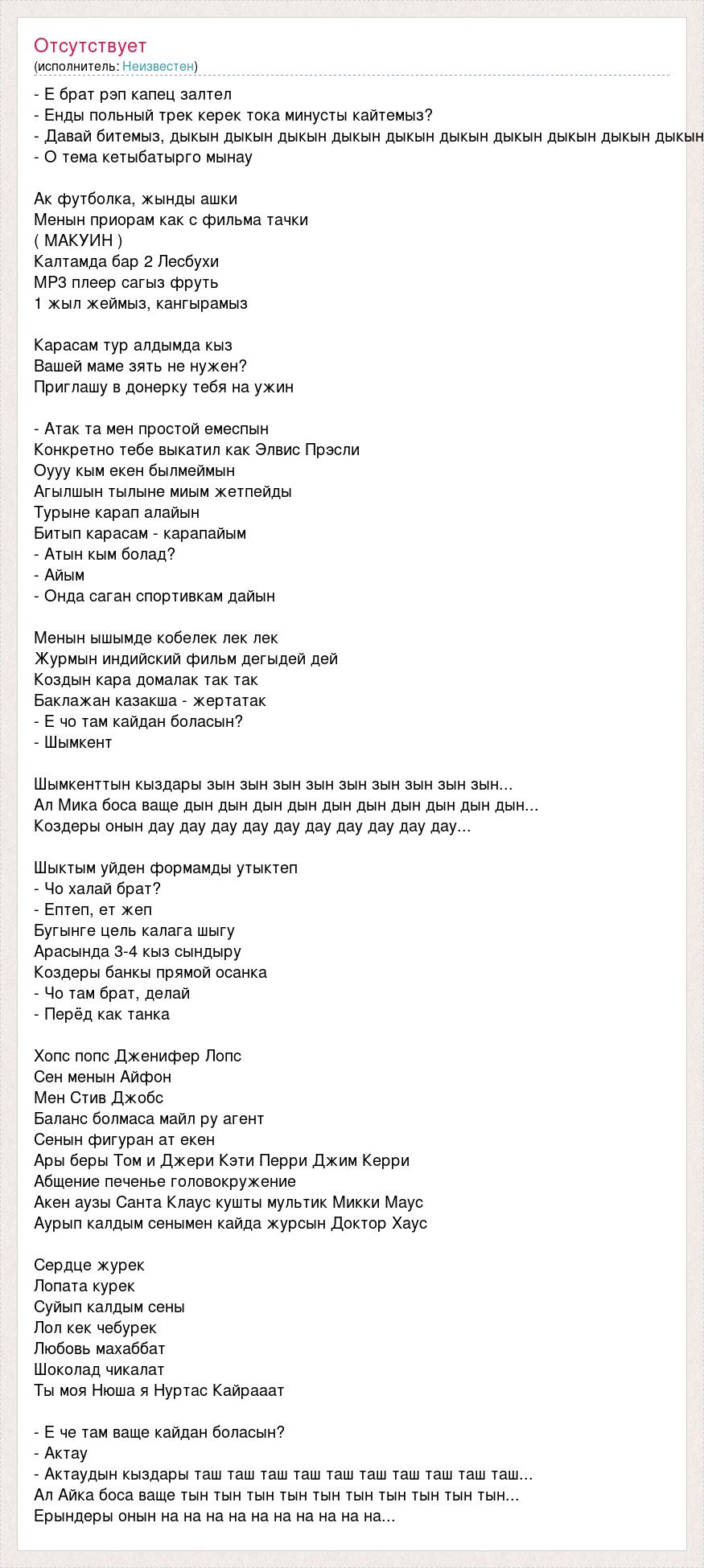 - Е брат рэп капец залтел - Енды польный трек керек тока минусты кайтемыз? - Давай битемыз, дыкын дыкын дыкын дыкын дыкын дыкын дыкын дыкын дыкын дыкын - О тема кетыбатырго мынау Ак футболка, жынды ашки Менын приорам как с фильма тачки ( МАКУИН ) Калтамда бар 2 Лесбухи MP3 плеер сагыз фруть 1 жыл жеймыз, кангырамыз Карасам тур алдымда кыз Вашей маме зять не нужен? Приглашу в донерку тебя на ужин - Атак та мен простой емеспын Конкретно тебе выкатил как Элвис Прэсли Оууу кым екен былмеймын Агылшын тылыне миым жетпейды Турыне карап алайын Битып карасам - карапайым - Атын кым болад? - Айым - Онда саган спортивкам дайын Менын ышымде кобелек лек лек Журмын индийский фильм дегыдей дей Коздын кара домалак так так Баклажан казакша - жертатак - Е чо там кайдан боласын? - Шымкент Шымкенттын кыздары зын зын зын зын зын зын зын зын зын... Ал Мика боса ваще дын дын дын дын дын дын дын дын дын дын... Коздеры онын дау дау дау дау дау дау дау дау дау дау... Шыктым уйден формамды утыктеп - Чо халай брат? - Ептеп, ет жеп Бугынге цель калага шыгу Арасында 3-4 кыз сындыру Коздеры банкы прямой осанка - Чо там брат, делай - Перёд как танка Хопс попс Дженифер Лопс Сен менын Айфон Мен Стив Джобс Баланс болмаса майл ру агент Сенын фигуран ат екен Ары беры Том и Джери Кэти Перри Джим Керри Абщение печенье головокружение Акен аузы Санта Клаус кушты мультик Микки Маус Аурып калдым сенымен кайда журсын Доктор Хаус Сердце журек Лопата курек Суйып калдым сены Лол кек чебурек Любовь махаббат Шоколад чикалат Ты моя Нюша я Нуртас Кайрааат - Е че там ваще кайдан боласын? - Актау - Актаудын кыздары таш таш таш таш таш таш таш таш таш таш... Ал Айка боса ваще тын тын тын тын тын тын тын тын тын тын... Ерындеры онын на на на на на на на на на на...