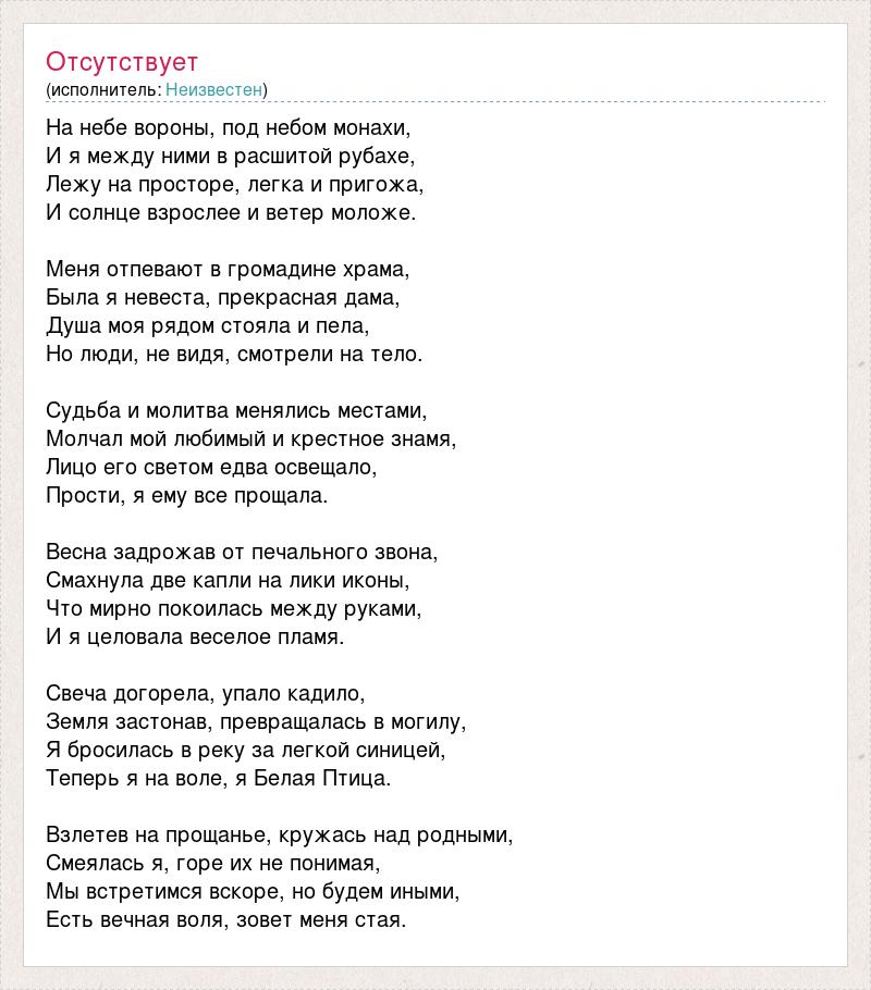 На небе вороны, под небом монахи, И я между ними в расшитой рубахе, Лежу на просторе, легка и пригожа, И солнце взрослее и ветер моложе. Меня отпевают в громадине храма, Была я невеста, прекрасная дама, Душа моя рядом стояла и пела, Но люди, не видя, смотрели на тело. Судьба и молитва менялись местами, Молчал мой любимый и крестное знамя, Лицо его светом едва освещало, Прости, я ему все прощала. Весна задрожав от печального звона, Смахнула две капли на лики иконы, Что мирно покоилась между руками, И я целовала веселое пламя. Свеча догорела, упало кадило, Земля застонав, превращалась в могилу, Я бросилась в реку за легкой синицей, Теперь я на воле, я Белая Птица. Взлетев на прощанье, кружась над родными, Смеялась я, горе их не понимая, Мы встретимся вскоре, но будем иными, Есть вечная воля, зовет меня стая.