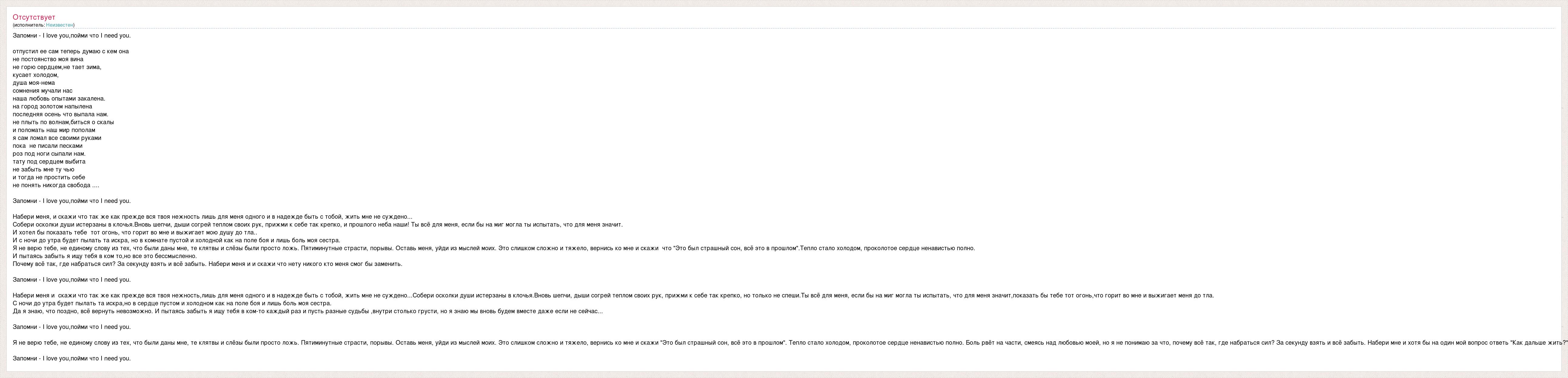 Запомни - I love you,пойми что I need you. отпустил ее сам теперь думаю с кем она не постоянство моя вина не горю сердцем,не тает зима, кусает холодом, душа моя-нема сомнения мучали нас наша любовь опытами закалена. на город золотом напылена последняя осень что выпала нам. не плыть по волнам,биться о скалы и поломать наш мир пополам я сам ломал все своими руками пока не писали песками роз под ноги сыпали нам. тату под сердцем выбита не забыть мне ту чью и тогда не простить себе не понять никогда свобода .... Запомни - I love you,пойми что I need you. Набери меня, и скажи что так же как прежде вся твоя нежность лишь для меня одного и в надежде быть с тобой, жить мне не суждено... Собери осколки души истерзаны в клочья.Вновь шепчи, дыши согрей теплом своих рук, прижми к себе так крепко, и прошлого неба наши! Ты всё для меня, если бы на миг могла ты испытать, что для меня значит. И хотел бы показать тебе тот огонь, что горит во мне и выжигает мою душу до тла.. И с ночи до утра будет пылать та искра, но в комнате пустой и холодной как на поле боя и лишь боль моя сестра. Я не верю тебе, не единому слову из тех, что были даны мне, те клятвы и слёзы были просто ложь. Пятиминутные страсти, порывы. Оставь меня, уйди из мыслей моих. Это слишком сложно и тяжело, вернись ко мне и скажи что "Это был страшный сон, всё это в прошлом".Тепло стало холодом, проколотое сердце ненавистью полно. И пытаясь забыть я ищу тебя в ком то,но все это бессмысленно. Почему всё так, где набраться сил? За секунду взять и всё забыть. Набери меня и и скажи что нету никого кто меня смог бы заменить. Запомни - I love you,пойми что I need you. Набери меня и скажи что так же как прежде вся твоя нежность,лишь для меня одного и в надежде быть с тобой, жить мне не суждено...Собери осколки души истерзаны в клочья.Вновь шепчи, дыши согрей теплом своих рук, прижми к себе так крепко, но только не спеши.Ты всё для меня, если бы на миг могла ты испытать, что для меня значит,показать бы тебе тот огонь,что горит во мне и выжигает меня до тла. С ночи до утра будет пылать та искра,но в сердце пустом и холодном как на поле боя и лишь боль моя сестра. Да я знаю, что поздно, всё вернуть невозможно. И пытаясь забыть я ищу тебя в ком-то каждый раз и пусть разные судьбы ,внутри столько грусти, но я знаю мы вновь будем вместе даже если не сейчас... Запомни - I love you,пойми что I need you. Я не верю тебе, не единому слову из тех, что были даны мне, те клятвы и слёзы были просто ложь. Пятиминутные страсти, порывы. Оставь меня, уйди из мыслей моих. Это слишком сложно и тяжело, вернись ко мне и скажи "Это был страшный сон, всё это в прошлом". Тепло стало холодом, проколотое сердце ненавистью полно. Боль рвёт на части, смеясь над любовью моей, но я не понимаю за что, почему всё так, где набраться сил? За секунду взять и всё забыть. Набери мне и хотя бы на один мой вопрос ответь "Как дальше жить?" Запомни - I love you,пойми что I need you.