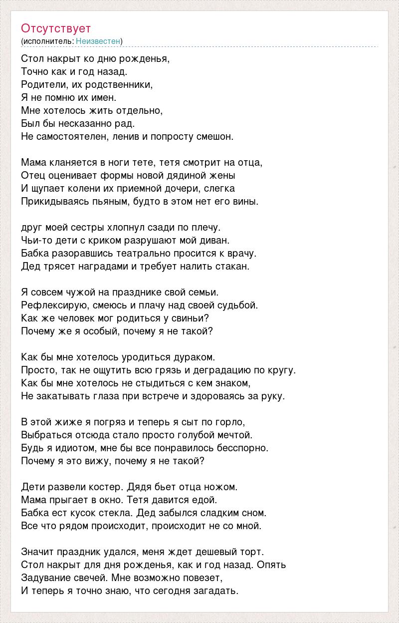 Стол накрыт ко дню рожденья, Точно как и год назад. Родители, их родственники, Я не помню их имен. Мне хотелось жить отдельно, Был бы несказанно рад. Не самостоятелен, ленив и попросту смешон. Мама кланяется в ноги тете, тетя смотрит на отца, Отец оценивает формы новой дядиной жены И щупает колени их приемной дочери, слегка Прикидываясь пьяным, будто в этом нет его вины. друг моей сестры хлопнул сзади по плечу. Чьи-то дети с криком разрушают мой диван. Бабка разоравшись театрально просится к врачу. Дед трясет наградами и требует налить стакан. Я совсем чужой на празднике свой семьи. Рефлексирую, смеюсь и плачу над своей судьбой. Как же человек мог родиться у свиньи? Почему же я особый, почему я не такой? Как бы мне хотелось уродиться дураком. Просто, так не ощутить всю грязь и деградацию по кругу. Как бы мне хотелось не стыдиться с кем знаком, Не закатывать глаза при встрече и здороваясь за руку. В этой жиже я погряз и теперь я сыт по горло, Выбраться отсюда стало просто голубой мечтой. Будь я идиотом, мне бы все понравилось бесспорно. Почему я это вижу, почему я не такой? Дети развели костер. Дядя бьет отца ножом. Мама прыгает в окно. Тетя давится едой. Бабка ест кусок стекла. Дед забылся сладким сном. Все что рядом происходит, происходит не со мной. Значит праздник удался, меня ждет дешевый торт. Стол накрыт для дня рожденья, как и год назад. Опять Задувание свечей. Мне возможно повезет, И теперь я точно знаю, что сегодня загадать.