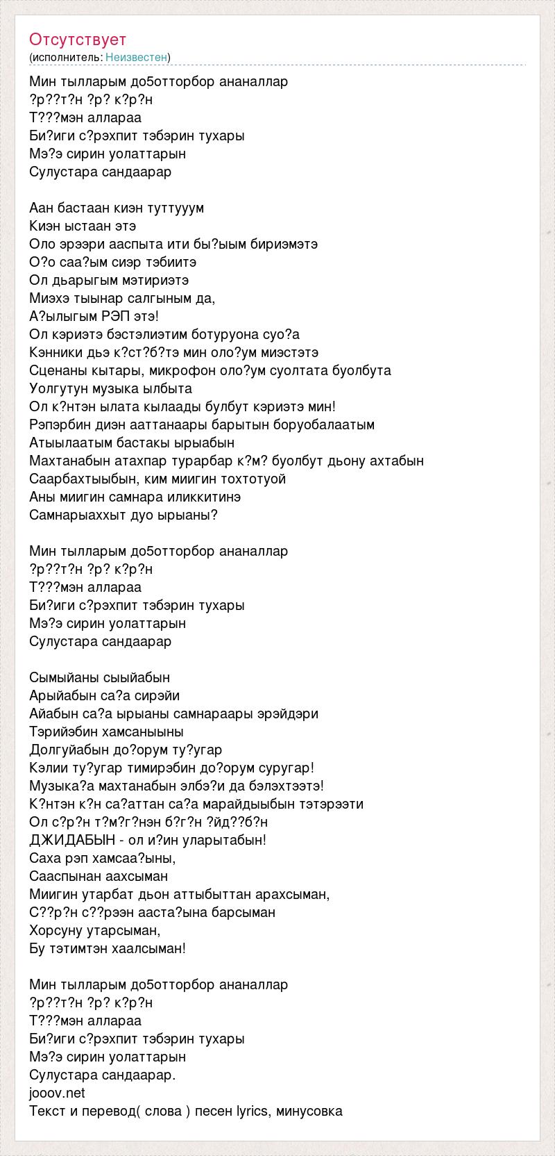 Мин тылларым до5отторбор ананаллар ?р??т?н ?р? к?р?н Т???мэн аллараа Би?иги с?рэхпит тэбэрин тухары Мэ?э сирин уолаттарын Сулустара сандаарар Аан бастаан киэн туттууум Киэн ыстаан этэ Оло эрээри ааспыта ити бы?ыым бириэмэтэ О?о саа?ым сиэр тэбиитэ Ол дьарыгым мэтириэтэ Миэхэ тыынар салгыным да, А?ылыгым РЭП этэ! Ол кэриэтэ бэстэлиэтим ботуруона суо?а Кэнники дьэ к?ст?б?тэ мин оло?ум миэстэтэ Сценаны кытары, микрофон оло?ум суолтата буолбута Уолгутун музыка ылбыта Ол к?нтэн ылата кылаады булбут кэриэтэ мин! Рэпэрбин диэн ааттанаары барытын боруобалаатым Атыылаатым бастакы ырыабын Махтанабын атахпар турарбар к?м? буолбут дьону ахтабын Саарбахтыыбын, ким миигин тохтотуой Аны миигин самнара иликкитинэ Самнарыаххыт дуо ырыаны? Мин тылларым до5отторбор ананаллар ?р??т?н ?р? к?р?н Т???мэн аллараа Би?иги с?рэхпит тэбэрин тухары Мэ?э сирин уолаттарын Сулустара сандаарар Сымыйаны сыыйабын Арыйабын са?а сирэйи Айабын са?а ырыаны самнараары эрэйдэри Тэрийэбин хамсаныыны Долгуйабын до?орум ту?угар Кэлии ту?угар тимирэбин до?орум суругар! Музыка?а махтанабын элбэ?и да бэлэхтээтэ! К?нтэн к?н са?аттан са?а марайдыыбын тэтэрээти Ол с?р?н т?м?г?нэн б?г?н ?йд??б?н ДЖИДАБЫН - ол и?ин уларытабын! Саха рэп хамсаа?ыны, Сааспынан аахсыман Миигин утарбат дьон аттыбыттан арахсыман, С??р?н с??рээн ааста?ына барсыман Хорсуну утарсыман, Бу тэтимтэн хаалсыман! Мин тылларым до5отторбор ананаллар ?р??т?н ?р? к?р?н Т???мэн аллараа Би?иги с?рэхпит тэбэрин тухары Мэ?э сирин уолаттарын Сулустара сандаарар. jooov.net Текст и перевод( слова ) песен lyrics, минусовка