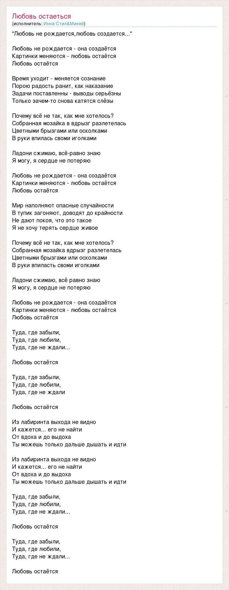 "Любовь не рождается,любовь создается..." Любовь не рождается - она создаётся Картинки меняются - любовь остаётся Любовь остаётся Время уходит - меняется сознание Порою радость ранит, как наказание Задачи поставленны - выводы серьёзны Только зачем-то снова катятся слёзы Почему всё не так, как мне хотелось? Собранная мозайка в вдрызг разлетелась Цветными брызгами или осколками В руки впилась своми иголками Ладони сжимаю, всё-равно знаю Я могу, я сердце не потеряю Любовь не рождается - она создаётся Картинки меняются - любовь остаётся Любовь остаётся Мир наполняют опасные случайности В тупик загоняют, доводят до крайности Не дают покоя, что это такое Я не хочу терять сердце живое Почему всё не так, как мне хотелось? Собранная мозайка вдрызг разлетелась Цветными брызгами или осколками В руки впиласть своми иголками Ладони сжимаю, всё равно знаю Я могу, я сердце не потеряю Любовь не рождается - она создаётся Картинки меняются - любовь остаётся Любовь остаётся Туда, где забыли, Туда, где любили, Туда, где не ждали... Любовь остаётся Туда, где забыли, Туда, где любили, Туда, где не ждали Любовь остаётся Из лабиринта выхода не видно И кажется... его не найти От вдоха и до выдоха Ты можешь только дальше дышать и идти Из лабиринта выхода не видно И кажется... его не найти От вдоха и до выдоха Ты можешь только дальше дышать и идти Туда, где забыли, Туда, где любили, Туда, где не ждали... Любовь остаётся Туда, где забыли, Туда, где любили, Туда, где не ждали... Любовь остаётся