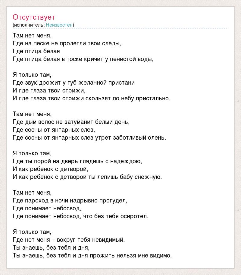 Там нет меня, Где на песке не пролегли твои следы, Где птица белая Где птица белая в тоске кричит у пенистой воды, Я только там, Где звук дрожит у губ желанной пристани И где глаза твои стрижи, И где глаза твои стрижи скользят по небу пристально. Там нет меня, Где дым волос не затуманит белый день, Где сосны от янтарных слез, Где сосны от янтарных слез утрет заботливый олень. Я только там, Где ты порой на дверь глядишь с надеждою, И как ребенок с детворой, И как ребенок с детворой ты лепишь бабу снежную. Там нет меня, Где пароход в ночи надрывно прогудел, Где понимает небосвод, Где понимает небосвод, что без тебя осиротел. Я только там, Где нет меня – вокруг тебя невидимый. Ты знаешь, без тебя и дня, Ты знаешь, без тебя и дня прожить нельзя мне видимо.