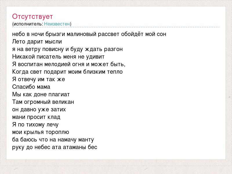небо в ночи брызги малиновый рассвет обойдёт мой сон Лето дарит мысли я на ветру повисну и буду ждать разгон Никакой писатель меня не удивит Я воспитан мелодией огня и может быть, Когда свет подарит моим близким тепло Я отвечу им так же Спасибо мама Мы как доне плагиат Там огромный великан он давно уже затих мани просит клад Я по тихому лечу мои крылья тороплю ба баюсь что на намачу манту руку до небес ата атаманы бес