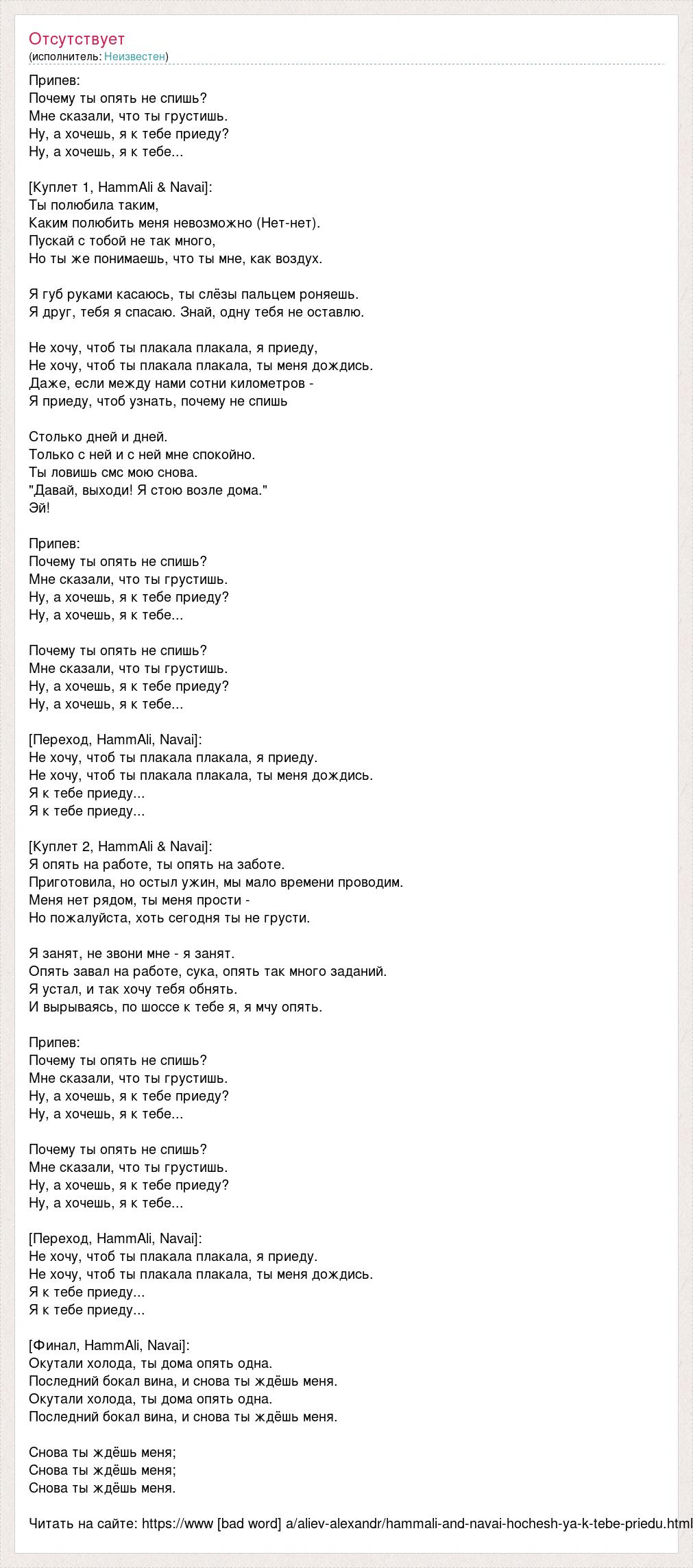 Припев: Почему ты опять не спишь? Мне сказали, что ты грустишь. Ну, а хочешь, я к тебе приеду? Ну, а хочешь, я к тебе... [Куплет 1, HammAli & Navai]: Ты полюбила таким, Каким полюбить меня невозможно (Нет-нет). Пускай с тобой не так много, Но ты же понимаешь, что ты мне, как воздух. Я губ руками касаюсь, ты слёзы пальцем роняешь. Я друг, тебя я спасаю. Знай, одну тебя не оставлю. Не хочу, чтоб ты плакала плакала, я приеду, Не хочу, чтоб ты плакала плакала, ты меня дождись. Даже, если между нами сотни километров - Я приеду, чтоб узнать, почему не спишь Столько дней и дней. Только с ней и с ней мне спокойно. Ты ловишь смс мою снова. "Давай, выходи! Я стою возле дома." Эй! Припев: Почему ты опять не спишь? Мне сказали, что ты грустишь. Ну, а хочешь, я к тебе приеду? Ну, а хочешь, я к тебе... Почему ты опять не спишь? Мне сказали, что ты грустишь. Ну, а хочешь, я к тебе приеду? Ну, а хочешь, я к тебе... [Переход, HammAli, Navai]: Не хочу, чтоб ты плакала плакала, я приеду. Не хочу, чтоб ты плакала плакала, ты меня дождись. Я к тебе приеду... Я к тебе приеду... [Куплет 2, HammAli & Navai]: Я опять на работе, ты опять на заботе. Приготовила, но остыл ужин, мы мало времени проводим. Меня нет рядом, ты меня прости - Но пожалуйста, хоть сегодня ты не грусти. Я занят, не звони мне - я занят. Опять завал на работе, сука, опять так много заданий. Я устал, и так хочу тебя обнять. И вырываясь, по шоссе к тебе я, я мчу опять. Припев: Почему ты опять не спишь? Мне сказали, что ты грустишь. Ну, а хочешь, я к тебе приеду? Ну, а хочешь, я к тебе... Почему ты опять не спишь? Мне сказали, что ты грустишь. Ну, а хочешь, я к тебе приеду? Ну, а хочешь, я к тебе... [Переход, HammAli, Navai]: Не хочу, чтоб ты плакала плакала, я приеду. Не хочу, чтоб ты плакала плакала, ты меня дождись. Я к тебе приеду... Я к тебе приеду... [Финал, HammAli, Navai]: Окутали холода, ты дома опять одна. Последний бокал вина, и снова ты ждёшь меня. Окутали холода, ты дома опять одна. Последний бокал вина, и снова ты ждёшь меня. Снова ты ждёшь меня; Снова ты ждёшь меня; Снова ты ждёшь меня. Читать на сайте: https://www [bad word] a/aliev-alexandr/hammali-and-navai-hochesh-ya-k-tebe-priedu.html