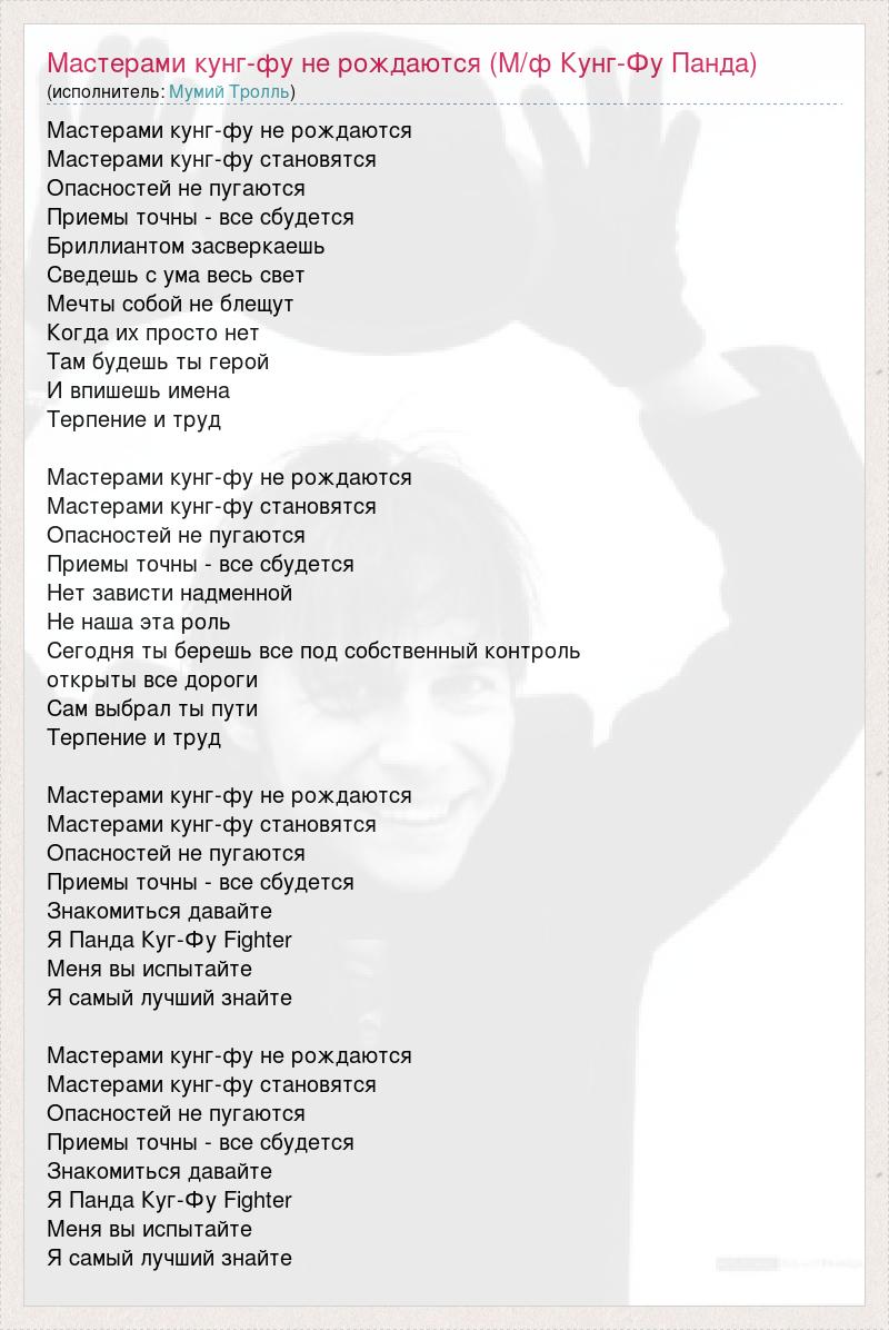 Мастерами кунг-фу не рождаются Мастерами кунг-фу становятся Опасностей не пугаются Приемы точны - все сбудется Бриллиантом засверкаешь Сведешь с ума весь свет Мечты собой не блещут Когда их просто нет Там будешь ты герой И впишешь имена Терпение и труд Мастерами кунг-фу не рождаются Мастерами кунг-фу становятся Опасностей не пугаются Приемы точны - все сбудется Нет зависти надменной Не наша эта роль Сегодня ты берешь все под собственный контроль открыты все дороги Сам выбрал ты пути Терпение и труд Мастерами кунг-фу не рождаются Мастерами кунг-фу становятся Опасностей не пугаются Приемы точны - все сбудется Знакомиться давайте Я Панда Куг-Фу Fighter Меня вы испытайте Я самый лучший знайте Мастерами кунг-фу не рождаются Мастерами кунг-фу становятся Опасностей не пугаются Приемы точны - все сбудется Знакомиться давайте Я Панда Куг-Фу Fighter Меня вы испытайте Я самый лучший знайте