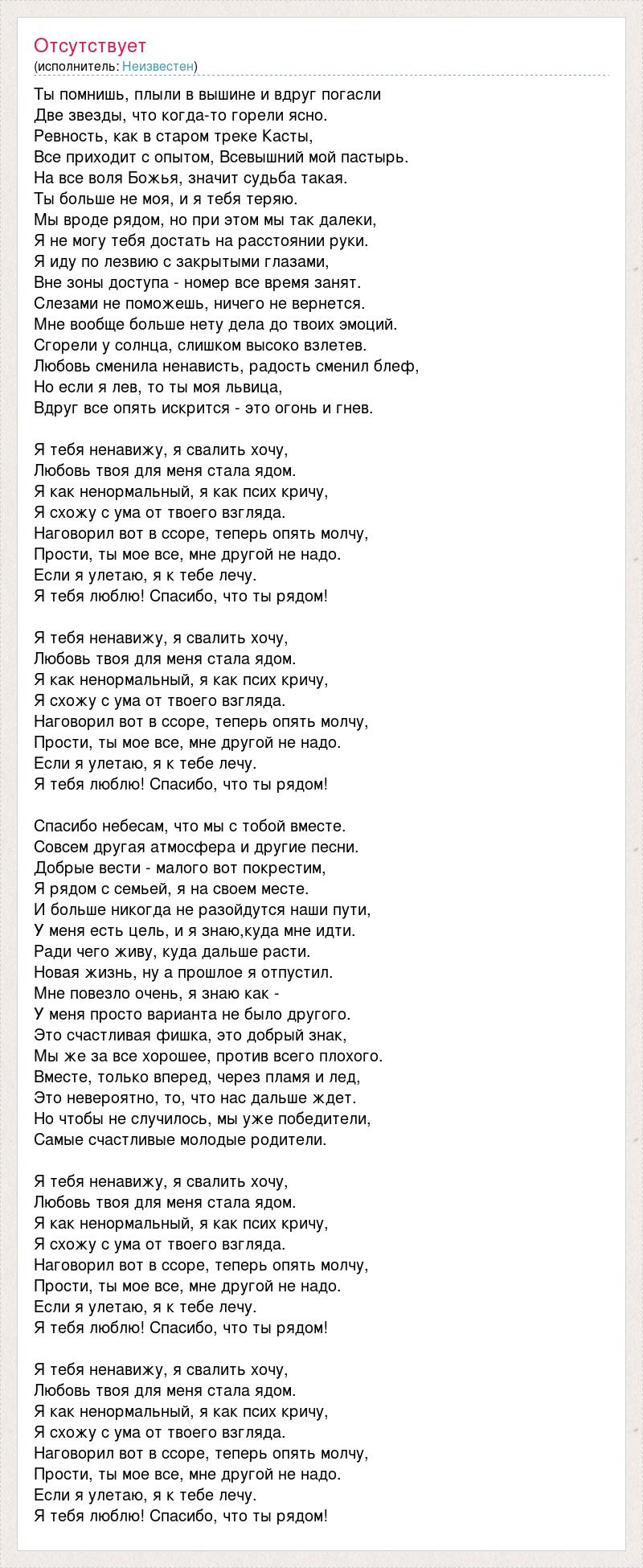 Ты помнишь, плыли в вышине и вдруг погасли Две звезды, что когда-то горели ясно. Ревность, как в старом треке Касты, Все приходит с опытом, Всевышний мой пастырь. На все воля Божья, значит судьба такая. Ты больше не моя, и я тебя теряю. Мы вроде рядом, но при этом мы так далеки, Я не могу тебя достать на расстоянии руки. Я иду по лезвию с закрытыми глазами, Вне зоны доступа - номер все время занят. Слезами не поможешь, ничего не вернется. Мне вообще больше нету дела до твоих эмоций. Сгорели у солнца, слишком высоко взлетев. Любовь сменила ненависть, радость сменил блеф, Но если я лев, то ты моя львица, Вдруг все опять искрится - это огонь и гнев. Я тебя ненавижу, я свалить хочу, Любовь твоя для меня стала ядом. Я как ненормальный, я как псих кричу, Я схожу с ума от твоего взгляда. Наговорил вот в ссоре, теперь опять молчу, Прости, ты мое все, мне другой не надо. Если я улетаю, я к тебе лечу. Я тебя люблю! Спасибо, что ты рядом! Я тебя ненавижу, я свалить хочу, Любовь твоя для меня стала ядом. Я как ненормальный, я как псих кричу, Я схожу с ума от твоего взгляда. Наговорил вот в ссоре, теперь опять молчу, Прости, ты мое все, мне другой не надо. Если я улетаю, я к тебе лечу. Я тебя люблю! Спасибо, что ты рядом! Спасибо небесам, что мы с тобой вместе. Совсем другая атмосфера и другие песни. Добрые вести - малого вот покрестим, Я рядом с семьей, я на своем месте. И больше никогда не разойдутся наши пути, У меня есть цель, и я знаю,куда мне идти. Ради чего живу, куда дальше расти. Новая жизнь, ну а прошлое я отпустил. Мне повезло очень, я знаю как - У меня просто варианта не было другого. Это счастливая фишка, это добрый знак, Мы же за все хорошее, против всего плохого. Вместе, только вперед, через пламя и лед, Это невероятно, то, что нас дальше ждет. Но чтобы не случилось, мы уже победители, Самые счастливые молодые родители. Я тебя ненавижу, я свалить хочу, Любовь твоя для меня стала ядом. Я как ненормальный, я как псих кричу, Я схожу с ума от твоего взгляда. Наговорил вот в ссоре, теперь опять молчу, Прости, ты мое все, мне другой не надо. Если я улетаю, я к тебе лечу. Я тебя люблю! Спасибо, что ты рядом! Я тебя ненавижу, я свалить хочу, Любовь твоя для меня стала ядом. Я как ненормальный, я как псих кричу, Я схожу с ума от твоего взгляда. Наговорил вот в ссоре, теперь опять молчу, Прости, ты мое все, мне другой не надо. Если я улетаю, я к тебе лечу. Я тебя люблю! Спасибо, что ты рядом!