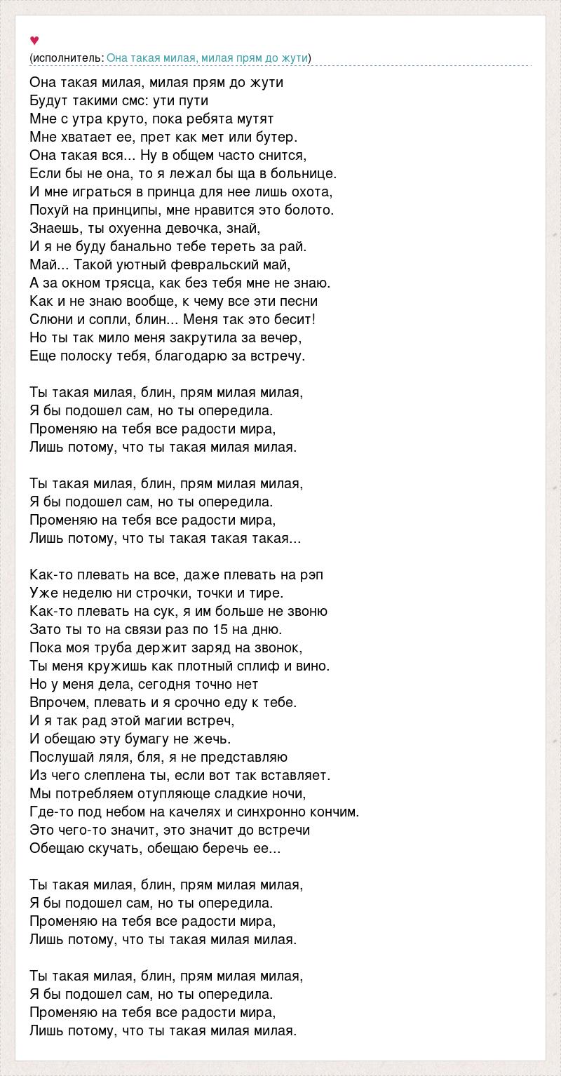 Она такая милая, милая прям до жути Будут такими смс: ути пути Мне с утра круто, пока ребята мутят Мне хватает ее, прет как мет или бутер. Она такая вся... Ну в общем часто снится, Если бы не она, то я лежал бы ща в больнице. И мне играться в принца для нее лишь охота, Похуй на принципы, мне нравится это болото. Знаешь, ты охуенна девочка, знай, И я не буду банально тебе тереть за рай. Май... Такой уютный февральский май, А за окном трясца, как без тебя мне не знаю. Как и не знаю вообще, к чему все эти песни Слюни и сопли, блин... Меня так это бесит! Но ты так мило меня закрутила за вечер, Еще полоску тебя, благодарю за встречу. Ты такая милая, блин, прям милая милая, Я бы подошел сам, но ты опередила. Променяю на тебя все радости мира, Лишь потому, что ты такая милая милая. Ты такая милая, блин, прям милая милая, Я бы подошел сам, но ты опередила. Променяю на тебя все радости мира, Лишь потому, что ты такая такая такая... Как-то плевать на все, даже плевать на рэп Уже неделю ни строчки, точки и тире. Как-то плевать на сук, я им больше не звоню Зато ты то на связи раз по 15 на дню. Пока моя труба держит заряд на звонок, Ты меня кружишь как плотный сплиф и вино. Но у меня дела, сегодня точно нет Впрочем, плевать и я срочно еду к тебе. И я так рад этой магии встреч, И обещаю эту бумагу не жечь. Послушай ляля, бля, я не представляю Из чего слеплена ты, если вот так вставляет. Мы потребляем отупляюще сладкие ночи, Где-то под небом на качелях и синхронно кончим. Это чего-то значит, это значит до встречи Обещаю скучать, обещаю беречь ее... Ты такая милая, блин, прям милая милая, Я бы подошел сам, но ты опередила. Променяю на тебя все радости мира, Лишь потому, что ты такая милая милая. Ты такая милая, блин, прям милая милая, Я бы подошел сам, но ты опередила. Променяю на тебя все радости мира, Лишь потому, что ты такая милая милая.