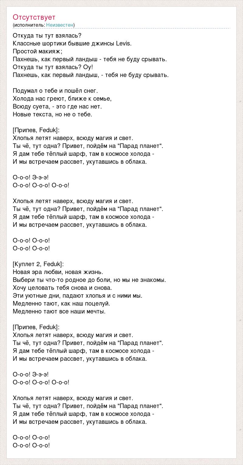 Откуда ты тут взялась? Классные шортики бывшие джинсы Levis. Простой макияж; Пахнешь, как первый ландыш - тебя не буду срывать. Откуда ты тут взялась? Оу! Пахнешь, как первый ландыш, - тебя не буду срывать. Подумал о тебе и пошёл снег. Холода нас греют, ближе к семье, Всюду суета, - это где нас нет. Новые текста, но не о тебе. [Припев, Feduk]: Хлопья летят наверх, всюду магия и свет. Ты чё, тут одна? Привет, пойдём на "Парад планет". Я дам тебе тёплый шарф, там в космосе холода - И мы встречаем рассвет, укутавшись в облака. О-о-о! Э-э-э! О-о-о! О-о-о! О-о-о! Хлопья летят наверх, всюду магия и свет. Ты чё, тут одна? Привет, пойдём на "Парад планет". Я дам тебе тёплый шарф, там в космосе холода - И мы встречаем рассвет, укутавшись в облака. О-о-о! О-о-о! О-о-о! О-о-о! [Куплет 2, Feduk]: Новая эра любви, новая жизнь. Выбери ты что-то родное до боли, но мы не знакомы. Хочу целовать тебя снова и снова. Эти уютные дни, падают хлопья и с ними мы. Медленно тают, как наш поцелуй. Медленно тают все наши мечты. [Припев, Feduk]: Хлопья летят наверх, всюду магия и свет. Ты чё, тут одна? Привет, пойдём на "Парад планет". Я дам тебе тёплый шарф, там в космосе холода - И мы встречаем рассвет, укутавшись в облака. О-о-о! Э-э-э! О-о-о! О-о-о! О-о-о! Хлопья летят наверх, всюду магия и свет. Ты чё, тут одна? Привет, пойдём на "Парад планет". Я дам тебе тёплый шарф, там в космосе холода - И мы встречаем рассвет, укутавшись в облака. О-о-о! О-о-о! О-о-о! О-о-о!