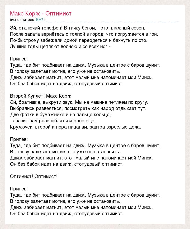 Эй, отключай телефон! В тачку бегом, - это пляжный сезон. После заката вернётесь с толпой в город, что погружается в гон. По-быстрому забежали домой переодеться и бахнуть по сто. Лучшие годы цепляют волною и со всех ног - Припев: Туда, где бит подбивает на движ. Музыка в центре с баров шумит. В голову залетает мотив, его уже не остановить. Движ забирает магнит, этот малый мне напоминает мой Минск. Он без бабок идет на движ, стопудовый оптимист. Второй Куплет: Макс Корж Эй, братишка, выкрути звук. Мы на машине петляем по кругу. Выбрались развеяться, посмотреть как народ отдыхает тут. Две фотки в бумажнике и на пальце кольцо, - значит нам расслабляться рано еще. Кружочек, второй и пора пацанам, завтра взрослые дела. Припев: Туда, где бит подбивает на движ. Музыка в центре с баров шумит. В голову залетает мотив, его уже не остановить. Движ забирает магнит, этот малый мне напоминает мой Минск. Он без бабок идет на движ, стопудовый оптимист. Оптимист! Оптимист! Припев: Туда, где бит подбивает на движ. Музыка в центре с баров шумит. В голову залетает мотив, его уже не остановить. Движ забирает магнит, этот малый мне напоминает мой Минск. Он без бабок идет на движ, стопудовый оптимист.