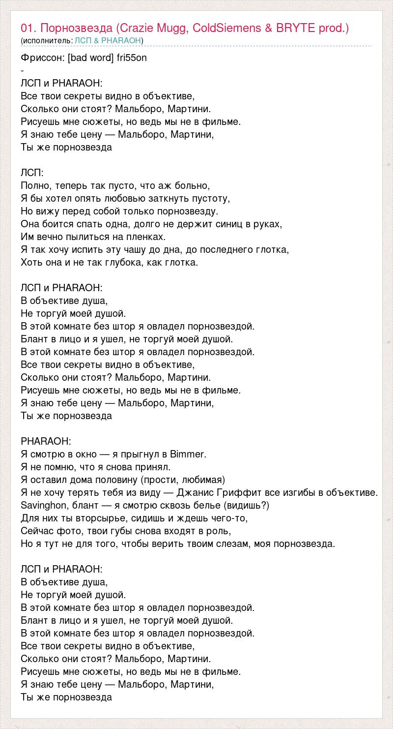 Фриссон: [bad word] fri55on - ЛСП и PHARAOH: Все твои секреты видно в объективе, Сколько они стоят? Мальборо, Мартини. Рисуешь мне сюжеты, но ведь мы не в фильме. Я знаю тебе цену — Мальборо, Мартини, Ты же порнозвезда ЛСП: Полно, теперь так пусто, что аж больно, Я бы хотел опять любовью заткнуть пустоту, Но вижу перед собой только порнозвезду. Она боится спать одна, долго не держит синиц в руках, Им вечно пылиться на пленках. Я так хочу испить эту чашу до дна, до последнего глотка, Хоть она и не так глубока, как глотка. ЛСП и PHARAOH: В объективе душа, Не торгуй моей душой. В этой комнате без штор я овладел порнозвездой. Блант в лицо и я ушел, не торгуй моей душой. В этой комнате без штор я овладел порнозвездой. Все твои секреты видно в объективе, Сколько они стоят? Мальборо, Мартини. Рисуешь мне сюжеты, но ведь мы не в фильме. Я знаю тебе цену — Мальборо, Мартини, Ты же порнозвезда PHARAOH: Я смотрю в окно — я прыгнул в Bimmer. Я не помню, что я снова принял. Я оставил дома половину (прости, любимая) Я не хочу терять тебя из виду — Джанис Гриффит все изгибы в объективе. Savinghon, блант — я смотрю сквозь белье (видишь?) Для них ты вторсырье, сидишь и ждешь чего-то, Сейчас фото, твои губы снова входят в роль, Но я тут не для того, чтобы верить твоим слезам, моя порнозвезда. ЛСП и PHARAOH: В объективе душа, Не торгуй моей душой. В этой комнате без штор я овладел порнозвездой. Блант в лицо и я ушел, не торгуй моей душой. В этой комнате без штор я овладел порнозвездой. Все твои секреты видно в объективе, Сколько они стоят? Мальборо, Мартини. Рисуешь мне сюжеты, но ведь мы не в фильме. Я знаю тебе цену — Мальборо, Мартини, Ты же порнозвезда