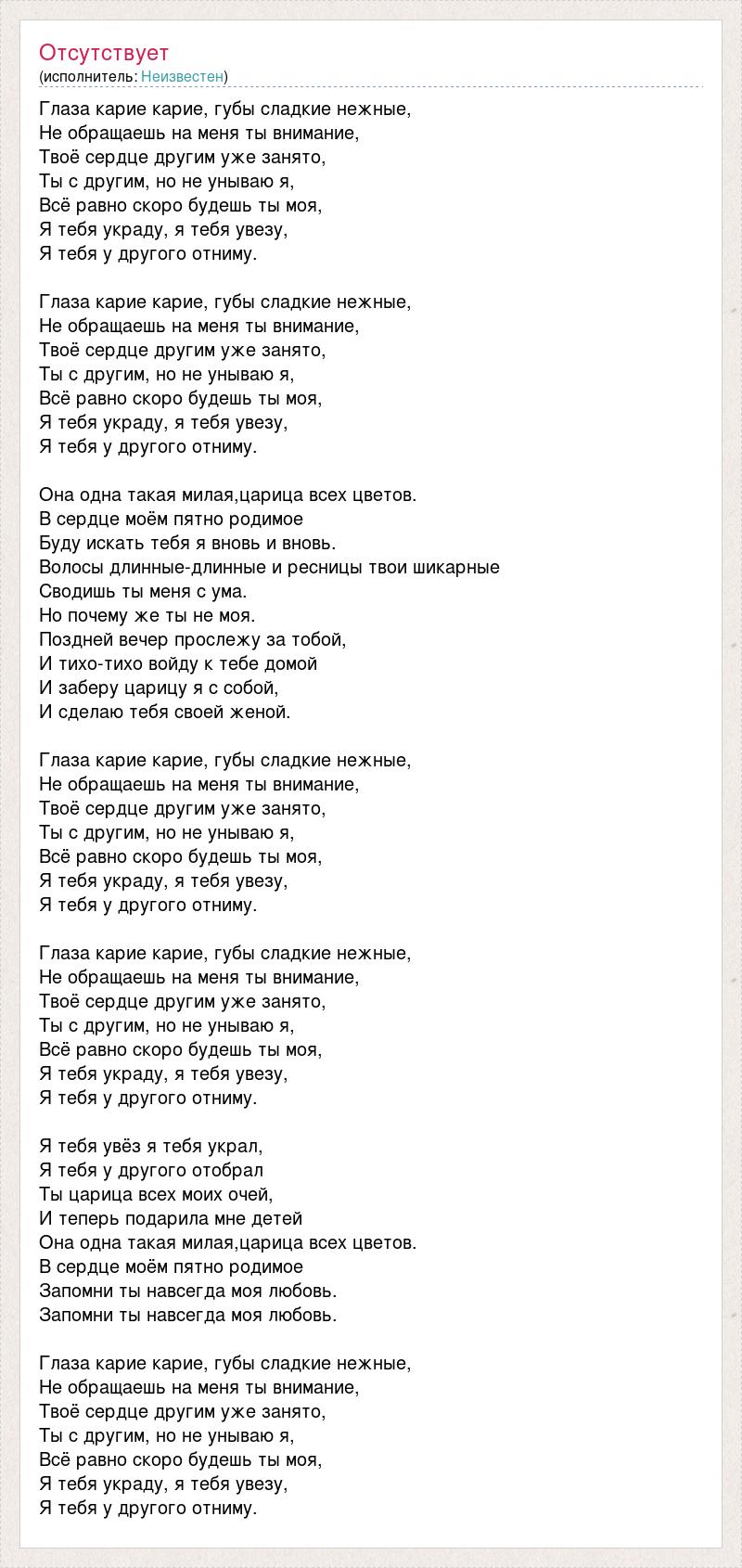 Глаза карие карие, губы сладкие нежные, Не обращаешь на меня ты внимание, Твоё сердце другим уже занято, Ты с другим, но не унываю я, Всё равно скоро будешь ты моя, Я тебя украду, я тебя увезу, Я тебя у другого отниму. Глаза карие карие, губы сладкие нежные, Не обращаешь на меня ты внимание, Твоё сердце другим уже занято, Ты с другим, но не унываю я, Всё равно скоро будешь ты моя, Я тебя украду, я тебя увезу, Я тебя у другого отниму. Она одна такая милая,царица всех цветов. В сердце моём пятно родимое Буду искать тебя я вновь и вновь. Волосы длинные-длинные и ресницы твои шикарные Сводишь ты меня с ума. Но почему же ты не моя. Поздней вечер прослежу за тобой, И тихо-тихо войду к тебе домой И заберу царицу я с собой, И сделаю тебя своей женой. Глаза карие карие, губы сладкие нежные, Не обращаешь на меня ты внимание, Твоё сердце другим уже занято, Ты с другим, но не унываю я, Всё равно скоро будешь ты моя, Я тебя украду, я тебя увезу, Я тебя у другого отниму. Глаза карие карие, губы сладкие нежные, Не обращаешь на меня ты внимание, Твоё сердце другим уже занято, Ты с другим, но не унываю я, Всё равно скоро будешь ты моя, Я тебя украду, я тебя увезу, Я тебя у другого отниму. Я тебя увёз я тебя украл, Я тебя у другого отобрал Ты царица всех моих очей, И теперь подарила мне детей Она одна такая милая,царица всех цветов. В сердце моём пятно родимое Запомни ты навсегда моя любовь. Запомни ты навсегда моя любовь. Глаза карие карие, губы сладкие нежные, Не обращаешь на меня ты внимание, Твоё сердце другим уже занято, Ты с другим, но не унываю я, Всё равно скоро будешь ты моя, Я тебя украду, я тебя увезу, Я тебя у другого отниму.