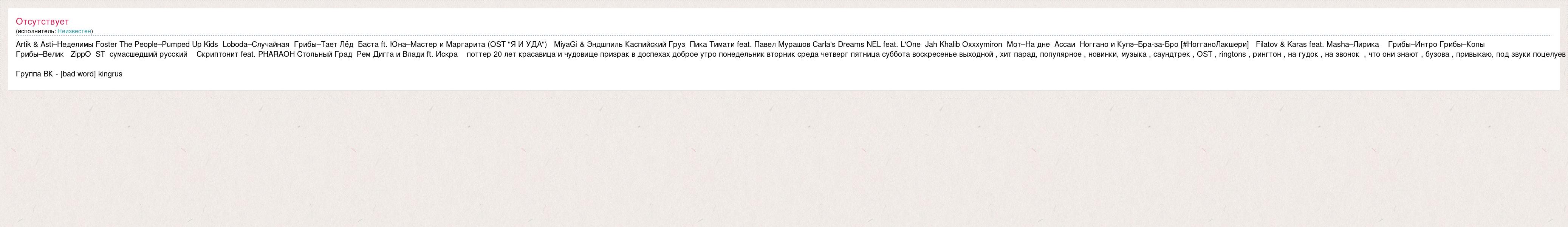 Artik & Asti–Неделимы Foster The People–Pumped Up Kids Loboda–Случайная Грибы–Тает Лёд Баста ft. Юна–Мастер и Маргарита (OST "Я И УДА") MiyaGi & Эндшпиль Каспийский Груз Пика Тимати feat. Павел Мурашов Carla's Dreams NEL feat. L'Оne Jah Khalib Oxxxymiron Мот–На дне Ассаи Ноггано и Купэ–Бра-за-Бро [#НогганоЛакшери] Filatov & Karas feat. Masha–Лирика Грибы–Интро Грибы–Копы Грибы–Велик ZippO ST сумасшедший русский Скриптонит feat. PHARAOH Стольный Град Рем Дигга и Влади ft. Искра поттер 20 лет красавица и чудовище призрак в доспехах доброе утро понедельник вторник среда четверг пятница суббота воскресенье выходной , хит парад, популярное , новинки, музыка , саундтрек , OST , ringtons , рингтон , на гудок , на звонок , что они знают , бузова , привыкаю, под звуки поцелуев Группа ВК - [bad word] kingrus