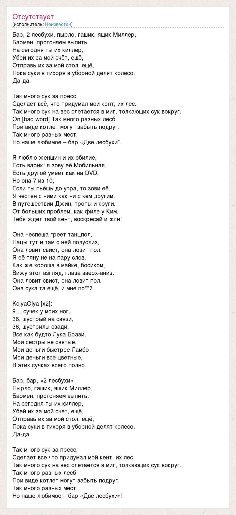 Бар, 2 лесбухи, пырло, гашик, ящик Миллер, Бармен, прогоняем выпить. На сегодня ты их киллер, Убей их за мой счёт, ещё, Отправь их за мой стол, ещё, Пока суки в тихоря в уборной делят колесо. Да-да. Так много сук за пресс, Сделает всё, что придумал мой кент, их лес. Так много сук на вес слетается в миг, толкающих сук вокруг. On [bad word] Так много разных лесб При виде котлет могут забыть подруг. Так много разных мест, Но наше любимое – бар «Две лесбухи”. Я люблю женщин и их обилие, Есть варик: я зову её Мобильная. Есть другой умеет как на DVD, Но она 7 из 10, Если ты пьёшь до утра, то зови её. Я честен с ними как ни с кем другим. В путешествии Джин, тропы и круги. От больших проблем, как филе у Ким. Тебя ждет твой кент, воскресай и жги! Она неспеша греет танцпол, Пацы тут и там с ней полуслиз, Она ловит свист, она ловит пол. Я её тяну не на пару слов. Как же хороша в майке, босиком, Вижу этот взгляд, глаза вверх-вниз. Она ловит свист, она ловит пол. Она сука та ещё, и мне по**й. KolyaOlya [х2]: 9… сучек у моих ног, 36, шустрый на связи, 36, шустрилы сзади, Все как будто Лука Брази. Мои сестры не святые, Мои деньги быстрее Ламбо Мои деньги все цветные, В этих сучках всего полно. Бар, бар, «2 лесбухи» Пырло, гашик, ящик Миллер, Бармен, прогоняем выпить. На сегодня ты их киллер, Убей их за мой счет, ещё, Отправь их за мой стол, ещё, Пока суки в тихоря в уборной делят колесо. Да-да. Так много сук за пресс, Сделает все что придумал мой кент, их лес. Так много сук на вес слетается в миг, толкающих сук вокруг. Так много разных лесб При виде котлет могут забыть подруг. Так много разных мест, Но наше любимое – бар «Две лесбухи»!