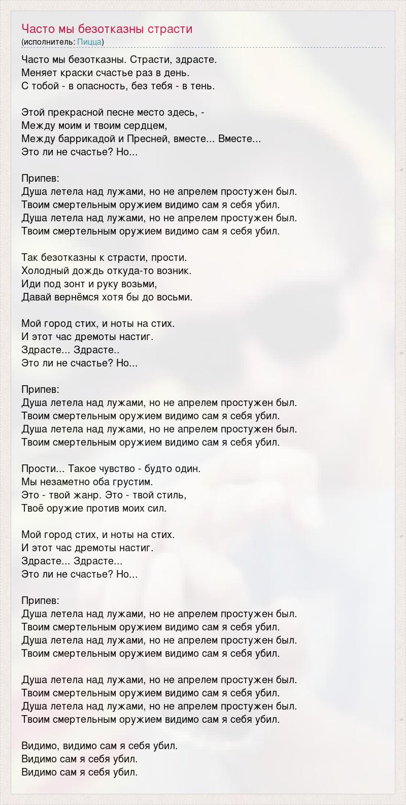 Часто мы безотказны. Страсти, здрасте. Меняет краски счастье раз в день. С тобой - в опасность, без тебя - в тень. Этой прекрасной песне место здесь, - Между моим и твоим сердцем, Между баррикадой и Пресней, вместе... Вместе... Это ли не счастье? Но... Припев: Душа летела над лужами, но не апрелем простужен был. Твоим смертельным оружием видимо сам я себя убил. Душа летела над лужами, но не апрелем простужен был. Твоим смертельным оружием видимо сам я себя убил. Так безотказны к страсти, прости. Холодный дождь откуда-то возник. Иди под зонт и руку возьми, Давай вернёмся хотя бы до восьми. Мой город стих, и ноты на стих. И этот час дремоты настиг. Здрасте... Здрасте.. Это ли не счастье? Но... Припев: Душа летела над лужами, но не апрелем простужен был. Твоим смертельным оружием видимо сам я себя убил. Душа летела над лужами, но не апрелем простужен был. Твоим смертельным оружием видимо сам я себя убил. Прости... Такое чувство - будто один. Мы незаметно оба грустим. Это - твой жанр. Это - твой стиль, Твоё оружие против моих сил. Мой город стих, и ноты на стих. И этот час дремоты настиг. Здрасте... Здрасте... Это ли не счастье? Но... Припев: Душа летела над лужами, но не апрелем простужен был. Твоим смертельным оружием видимо сам я себя убил. Душа летела над лужами, но не апрелем простужен был. Твоим смертельным оружием видимо сам я себя убил. Душа летела над лужами, но не апрелем простужен был. Твоим смертельным оружием видимо сам я себя убил. Душа летела над лужами, но не апрелем простужен был. Твоим смертельным оружием видимо сам я себя убил. Видимо, видимо сам я себя убил. Видимо сам я себя убил. Видимо сам я себя убил.