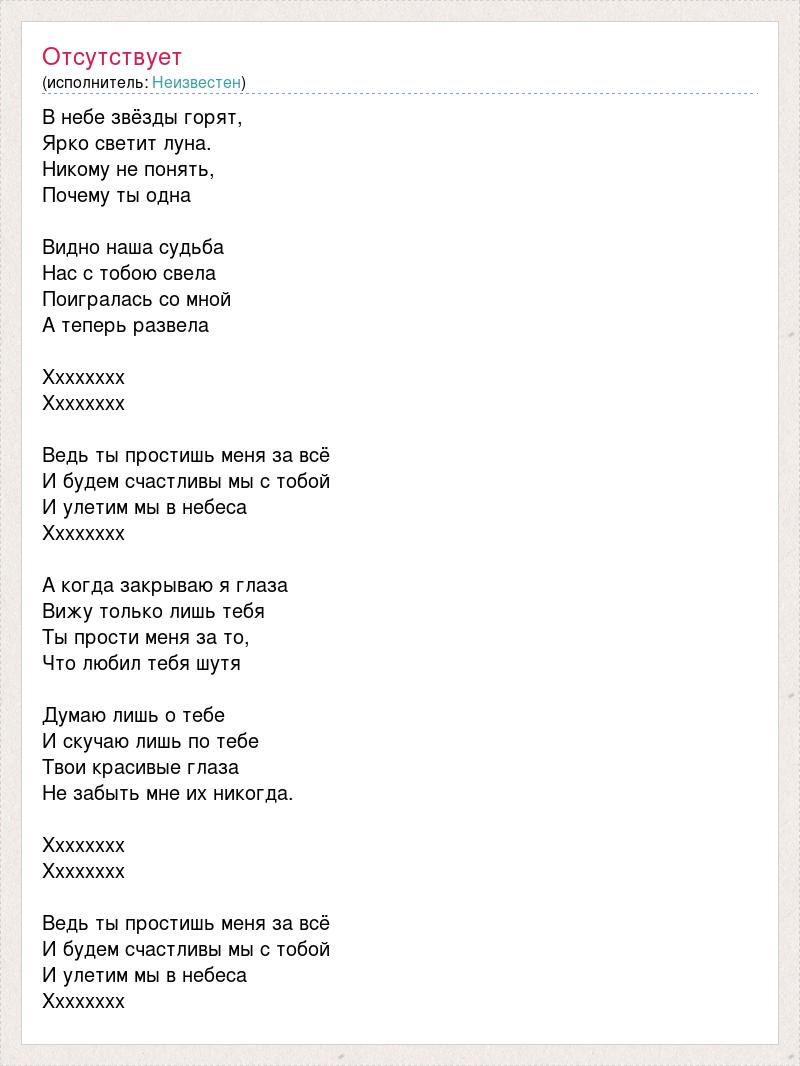 В небе звёзды горят, Ярко светит луна. Никому не понять, Почему ты одна Видно наша судьба Нас с тобою свела Поигралась со мной А теперь развела Хххххххх Хххххххх Ведь ты простишь меня за всё И будем счастливы мы с тобой И улетим мы в небеса Хххххххх А когда закрываю я глаза Вижу только лишь тебя Ты прости меня за то, Что любил тебя шутя Думаю лишь о тебе И скучаю лишь по тебе Твои красивые глаза Не забыть мне их никогда. Хххххххх Хххххххх Ведь ты простишь меня за всё И будем счастливы мы с тобой И улетим мы в небеса Хххххххх
